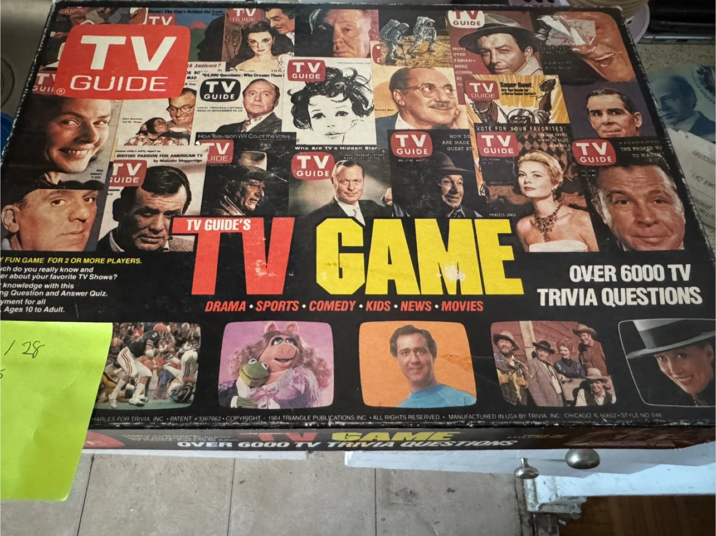 This is TV Guide's TV Game, a trivia board game manufactured in 1984. It comes with over 6000 TV trivia questions covering drama, sports, comedy, kids, news, and movies. The game is for 2 or more players and is recommended for ages 10 to adult. Test your knowledge on your favourite TV shows!