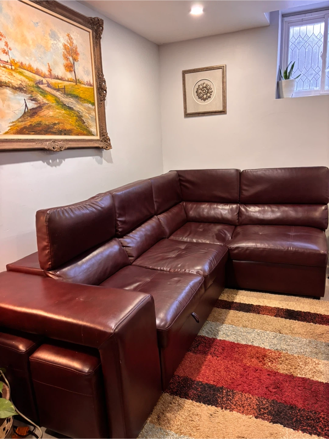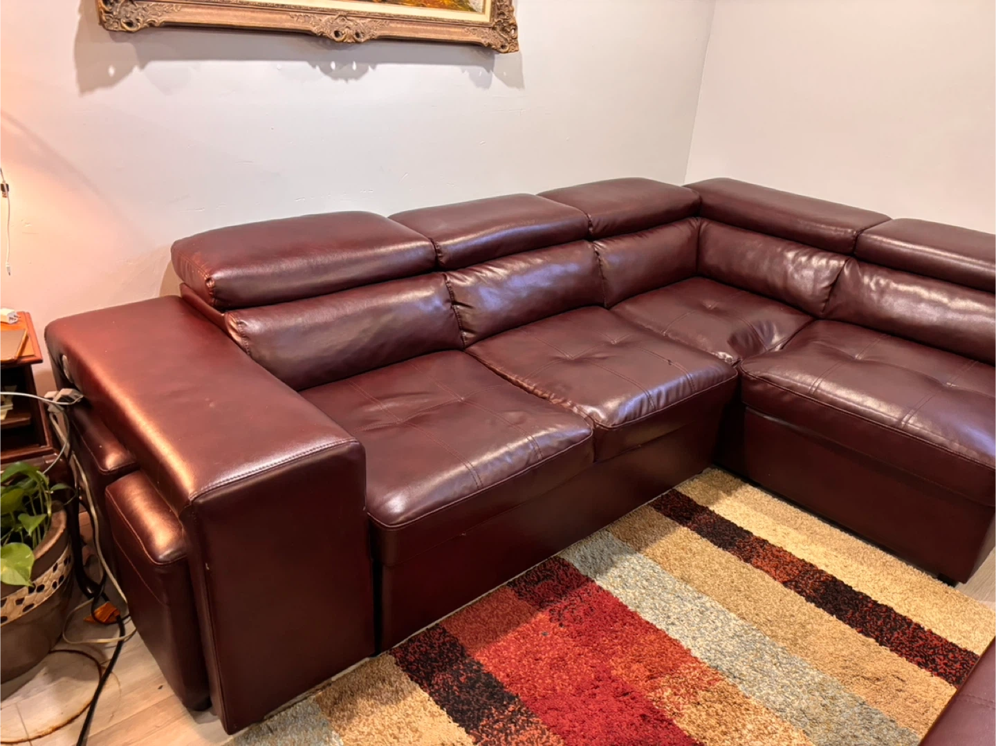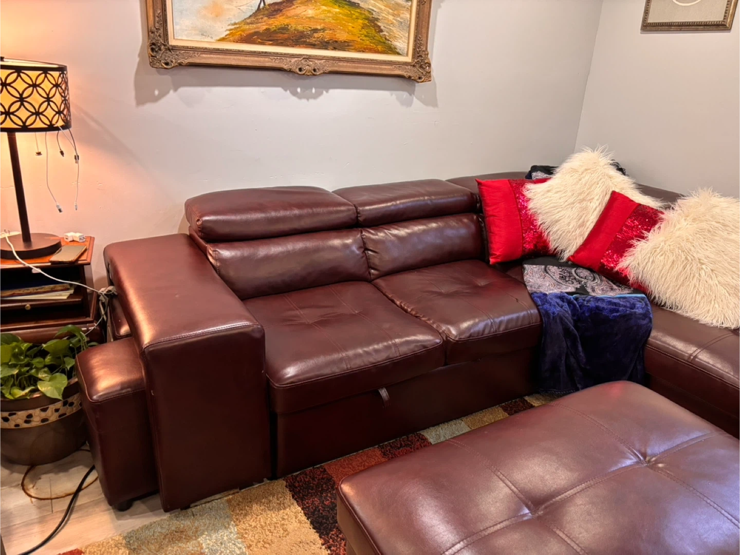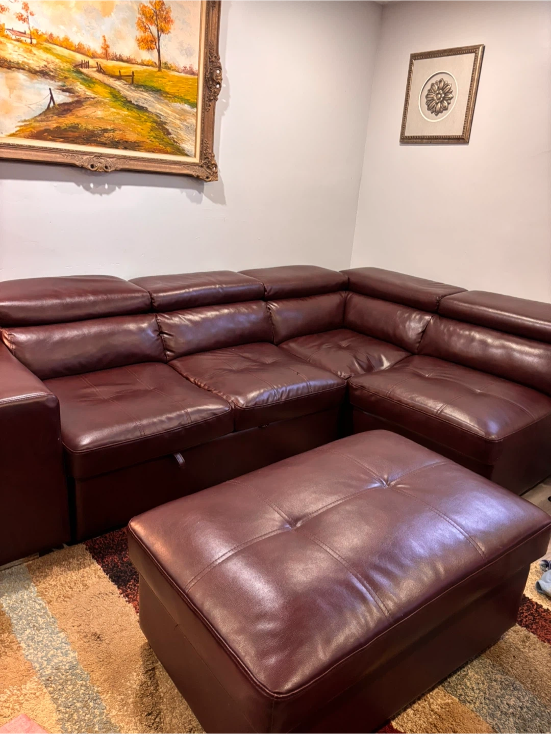 This spacious pullout sectional sofa bed is upholstered in a rich, dark reddish brown leather. It features multiple seating sections and two matching ottomans that can be used as footrests or extra seating. Storage compartments are built into the sofa sections. Built in 2 USB ports . Selling because I am moving asking price $350.