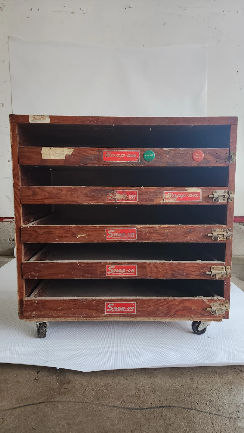 Vintage Snap-on wood 5 drawer tool chest organizer. It's great for organizing tools and small parts. This unit has wheels for easy transport and a peg board on one side. Would make a great refinishing project if you're into that!