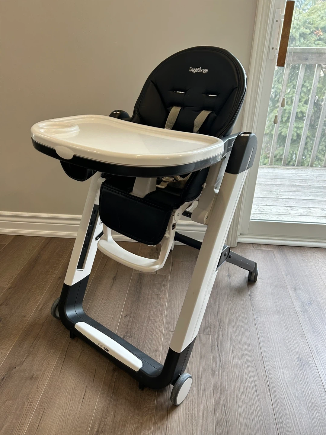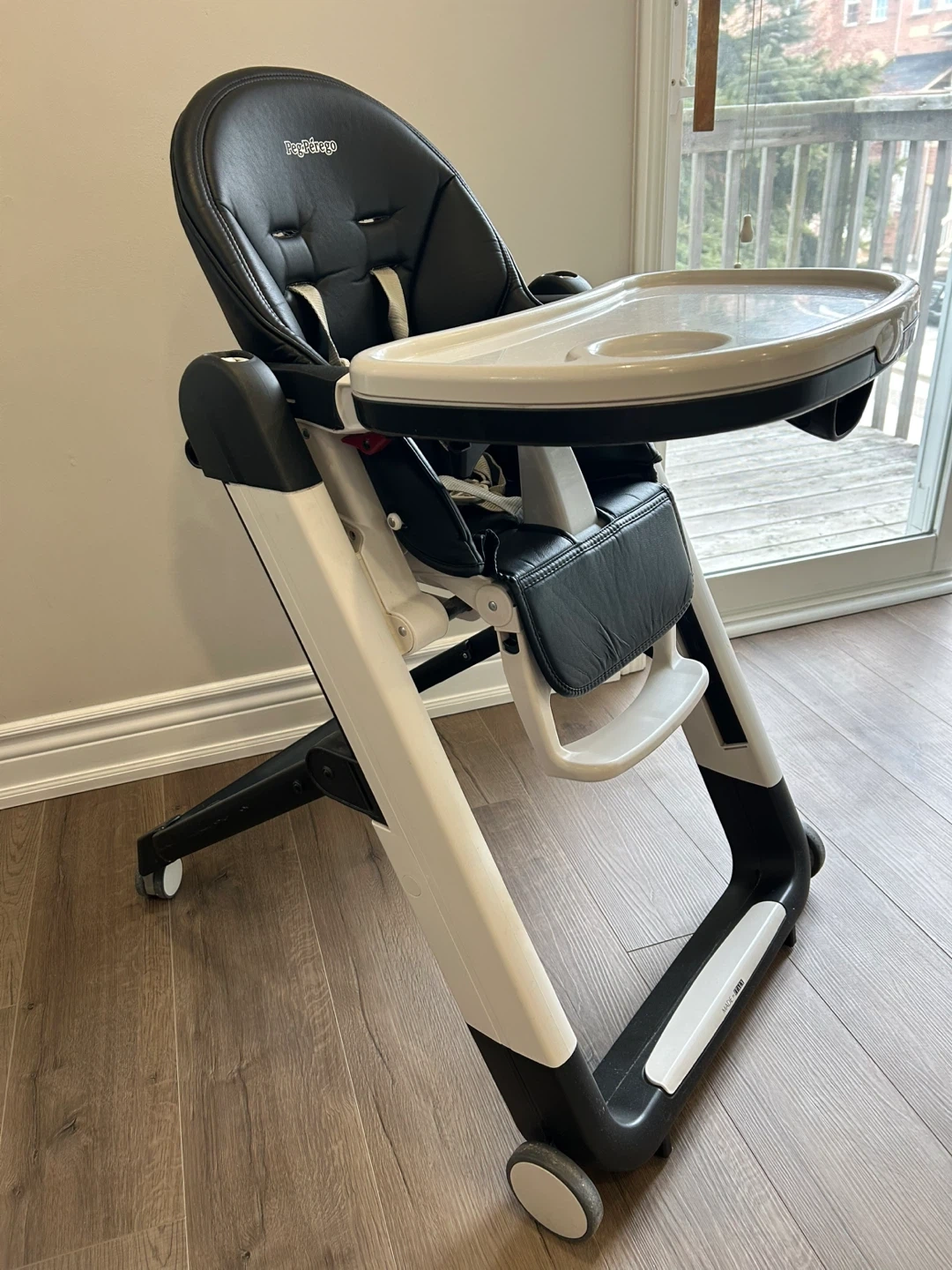 Peg-Pérego high chair with a black leather seat and white tray. It features a five-point harness for safety. This chair is adjustable for your child's comfort and includes a removable tray.