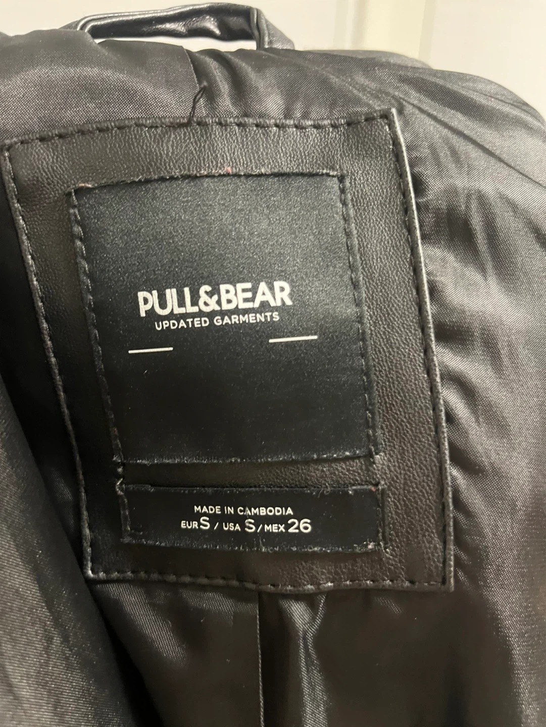 Black faux leather blazer from PULL&BEAR. Updated garments style. Made in Cambodia. Size S / MEX 26. Blazer has a smooth lining and two front pockets.
