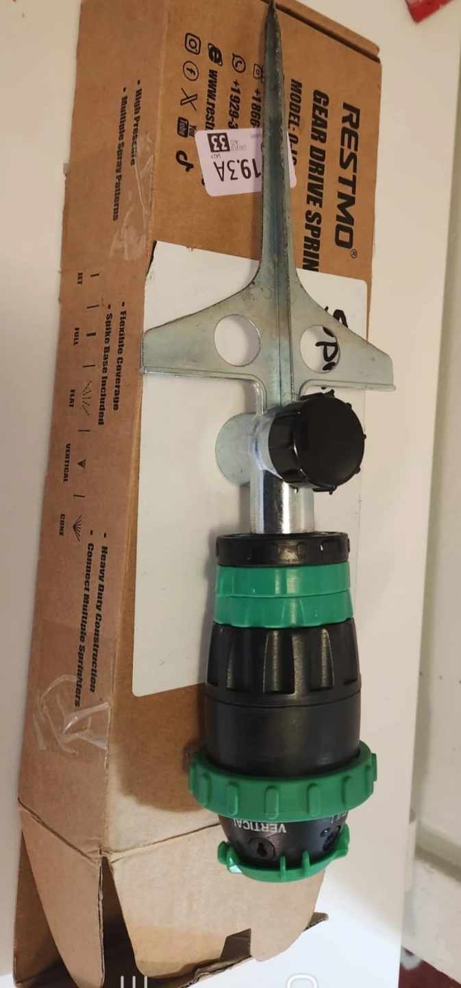 This is a RESTMO Gear Drive Sprinkler with a spike base. It offers multiple spray patterns and flexible coverage. It's built with heavy-duty construction. This sprinkler is useful for watering lawns and gardens.