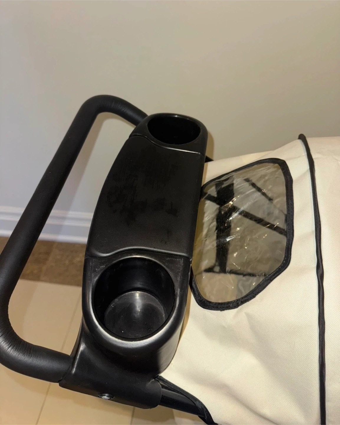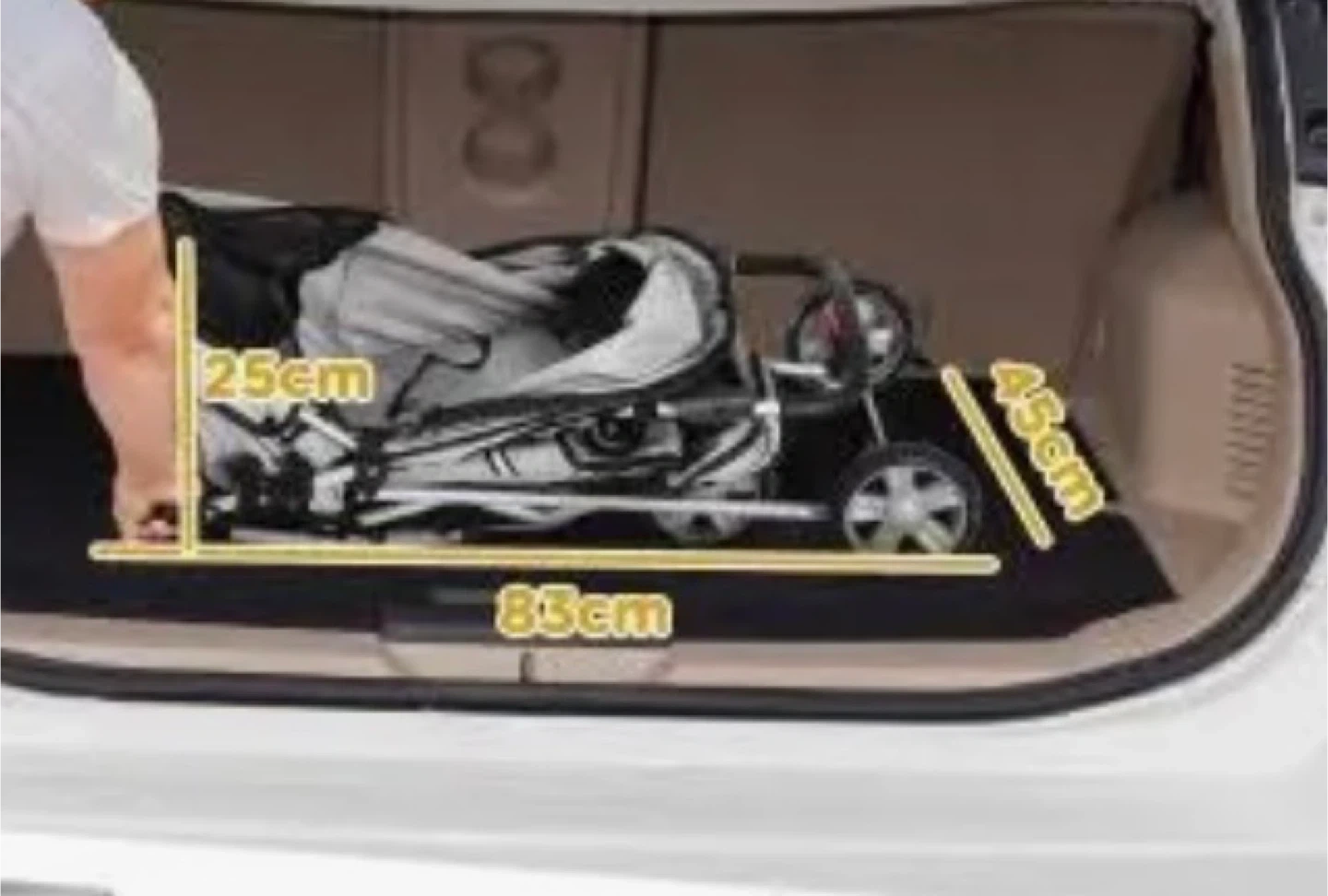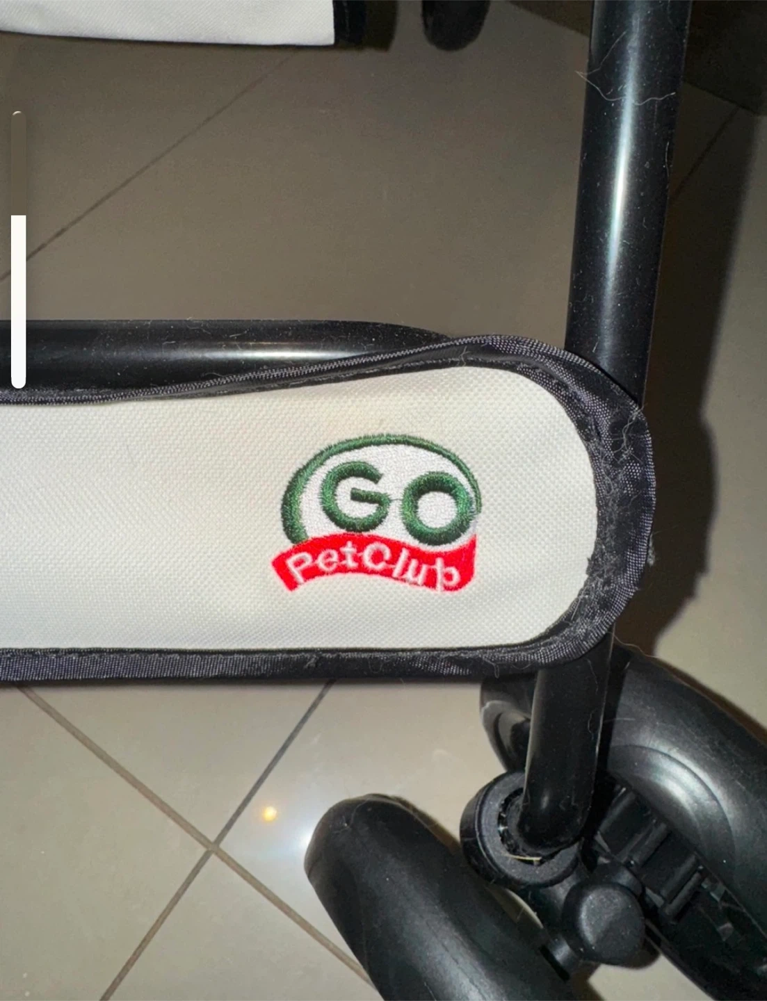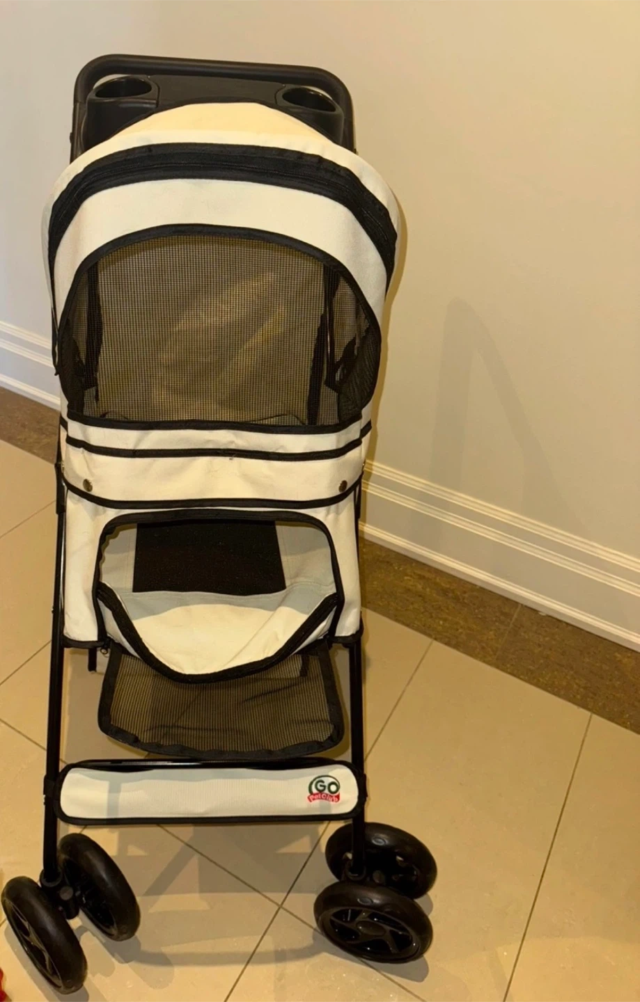 GO Pet Club pet stroller in white and black. It's a convenient way to travel with your pet. Includes a storage basket and cup holders. When folded, it measures 85cm long, 45cm high, and 25cm wide.