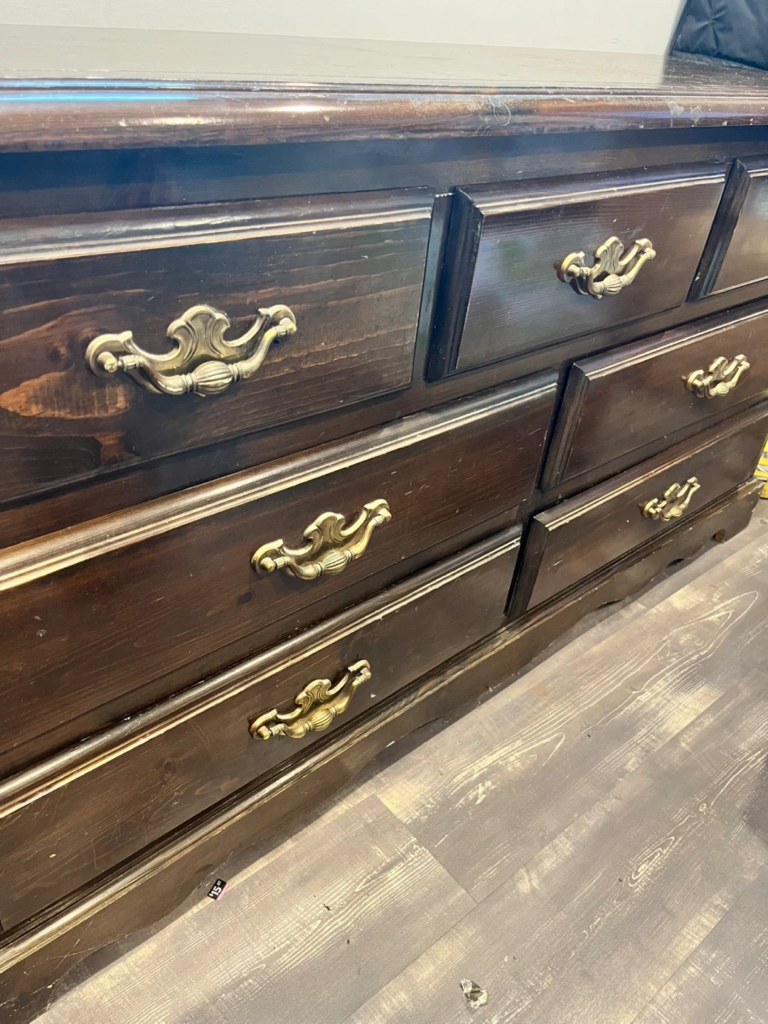 This dresser has a dark wood finish and features seven drawers for ample storage. It's perfect for a bedroom or closet. The brass hardware adds a classic touch.