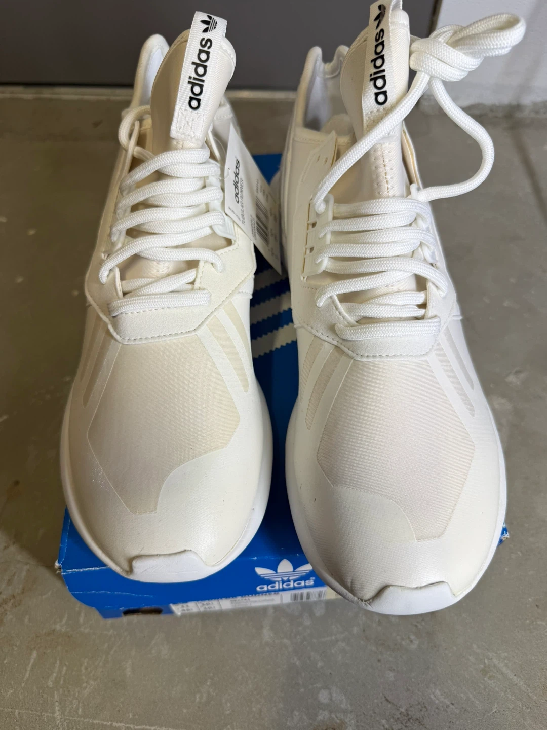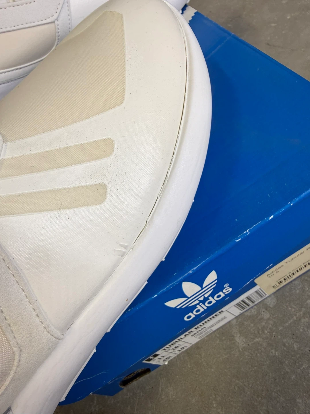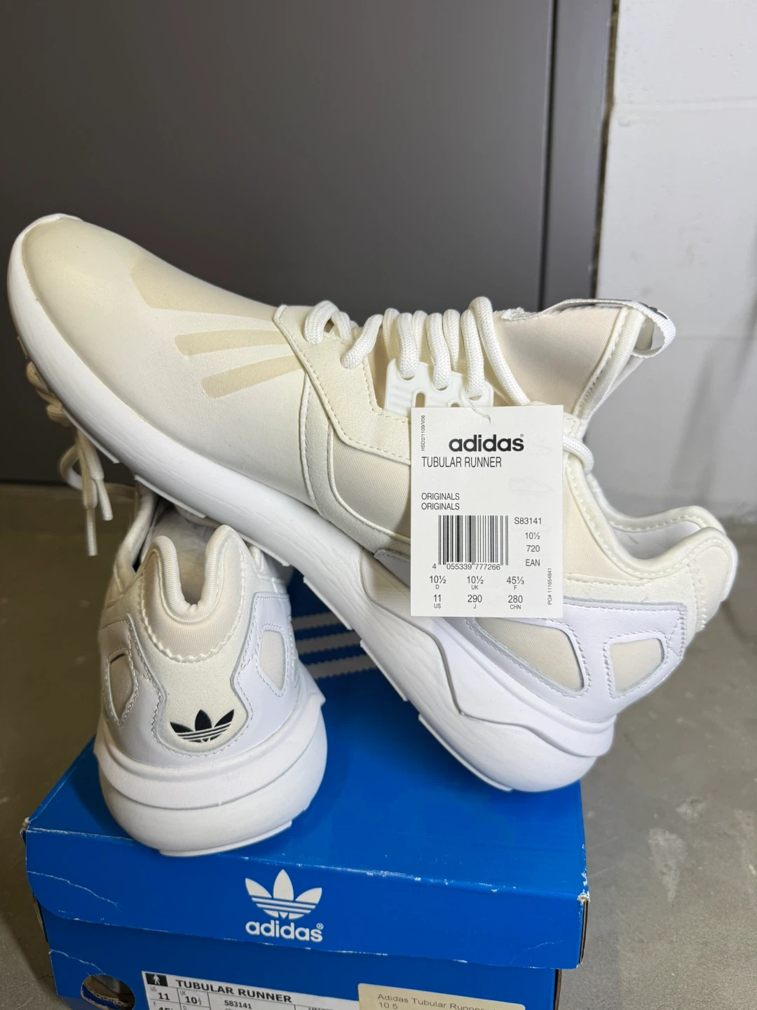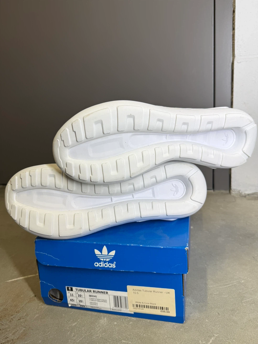 Adidas Tubular Runner sneakers in a clean white colour. Original box included. Size is UK 10.5, US 11, EU 45, 290mm. Discounted because its aged.