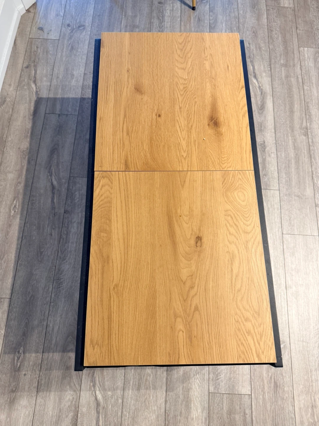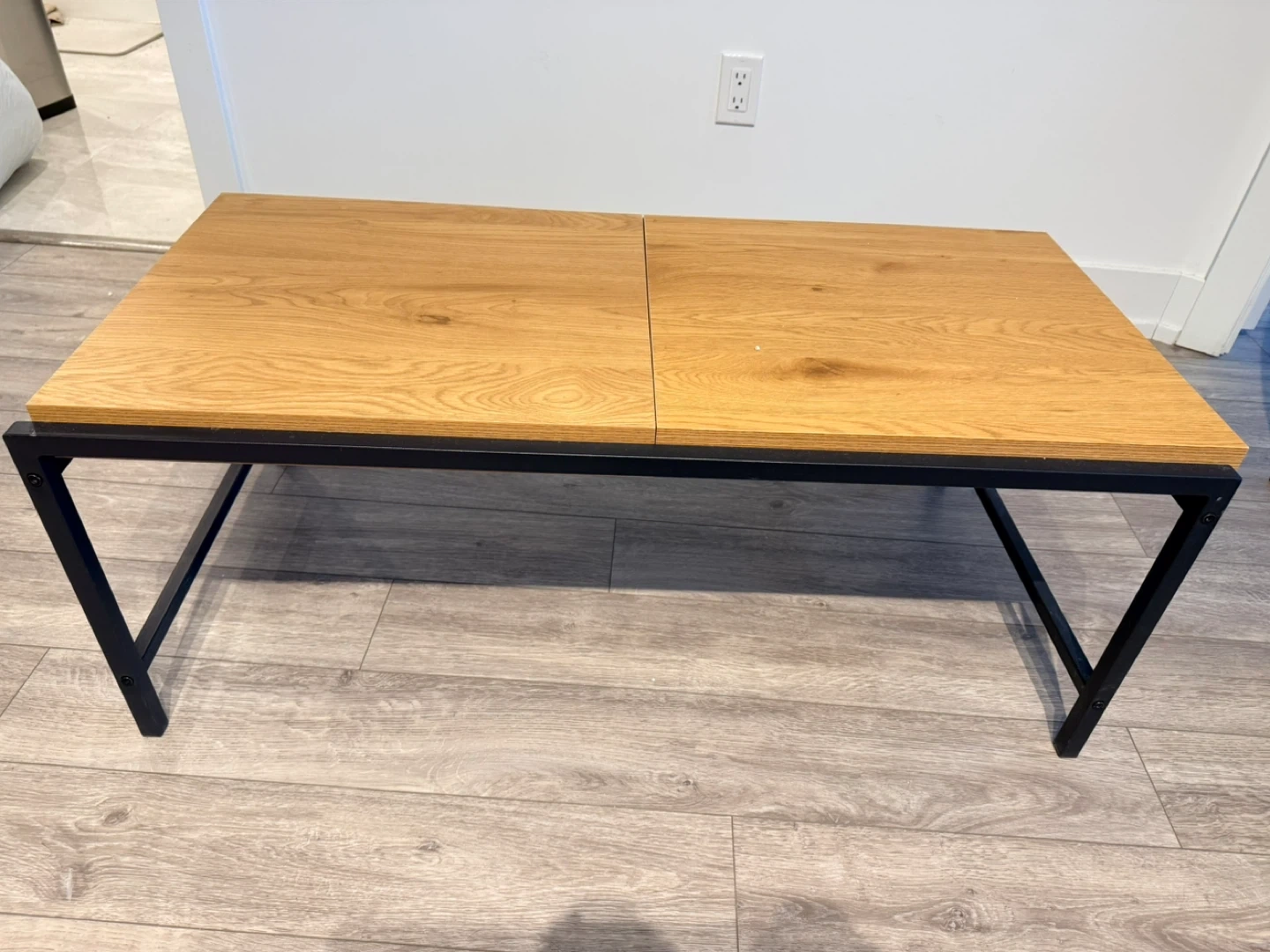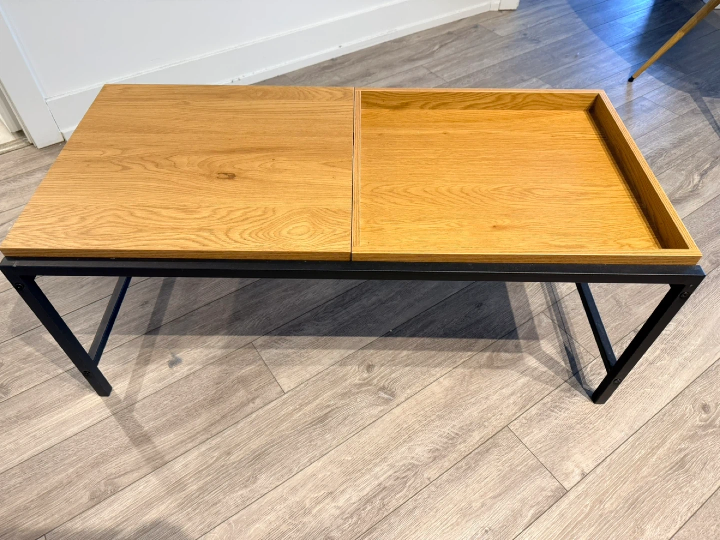 A contemporary coffee table featuring a warm, wood-grain top with a clever lift-up section that reveals storage space. It's supported by a sturdy black metal frame. This table adds both style and functionality to your living room!