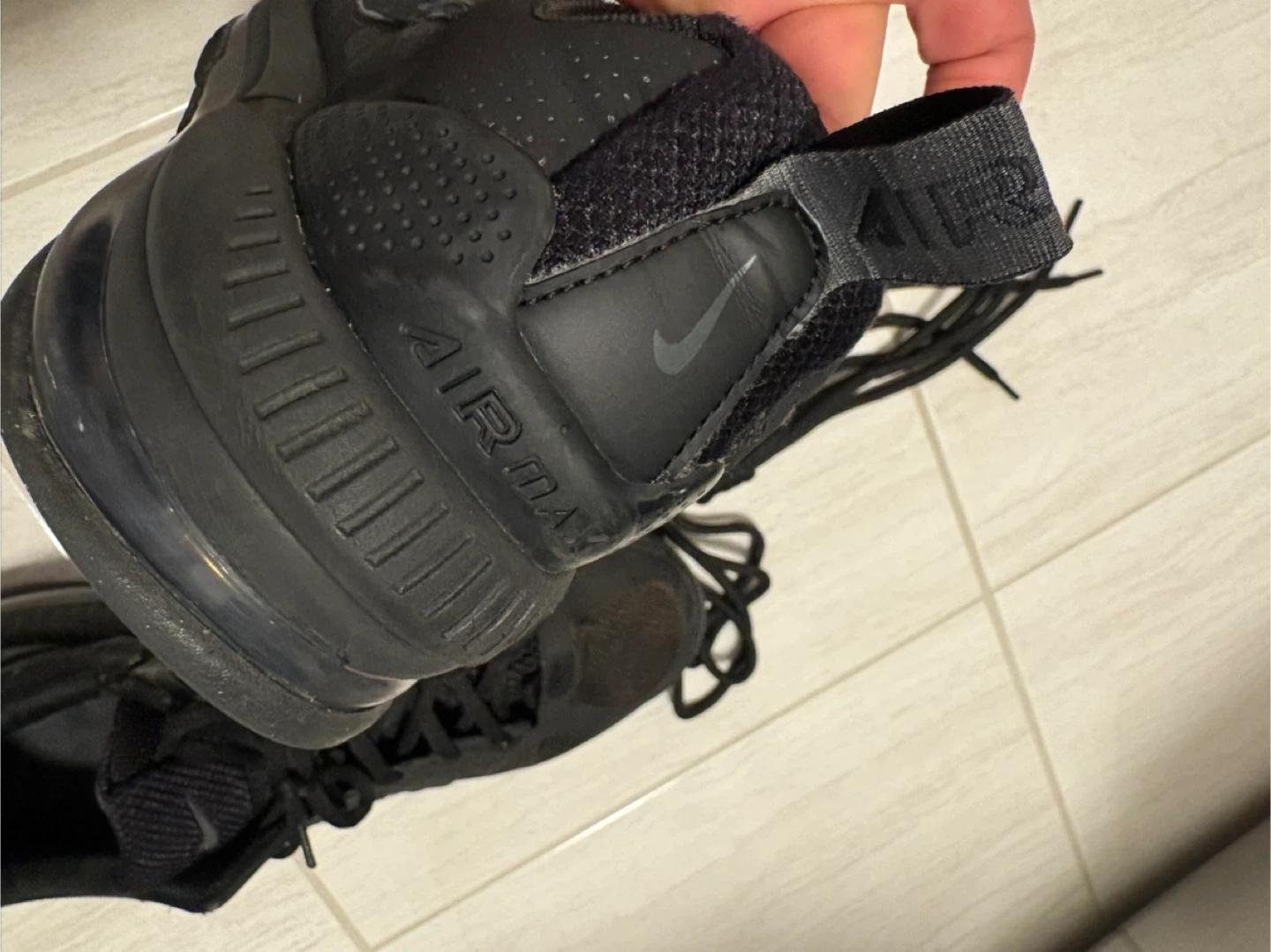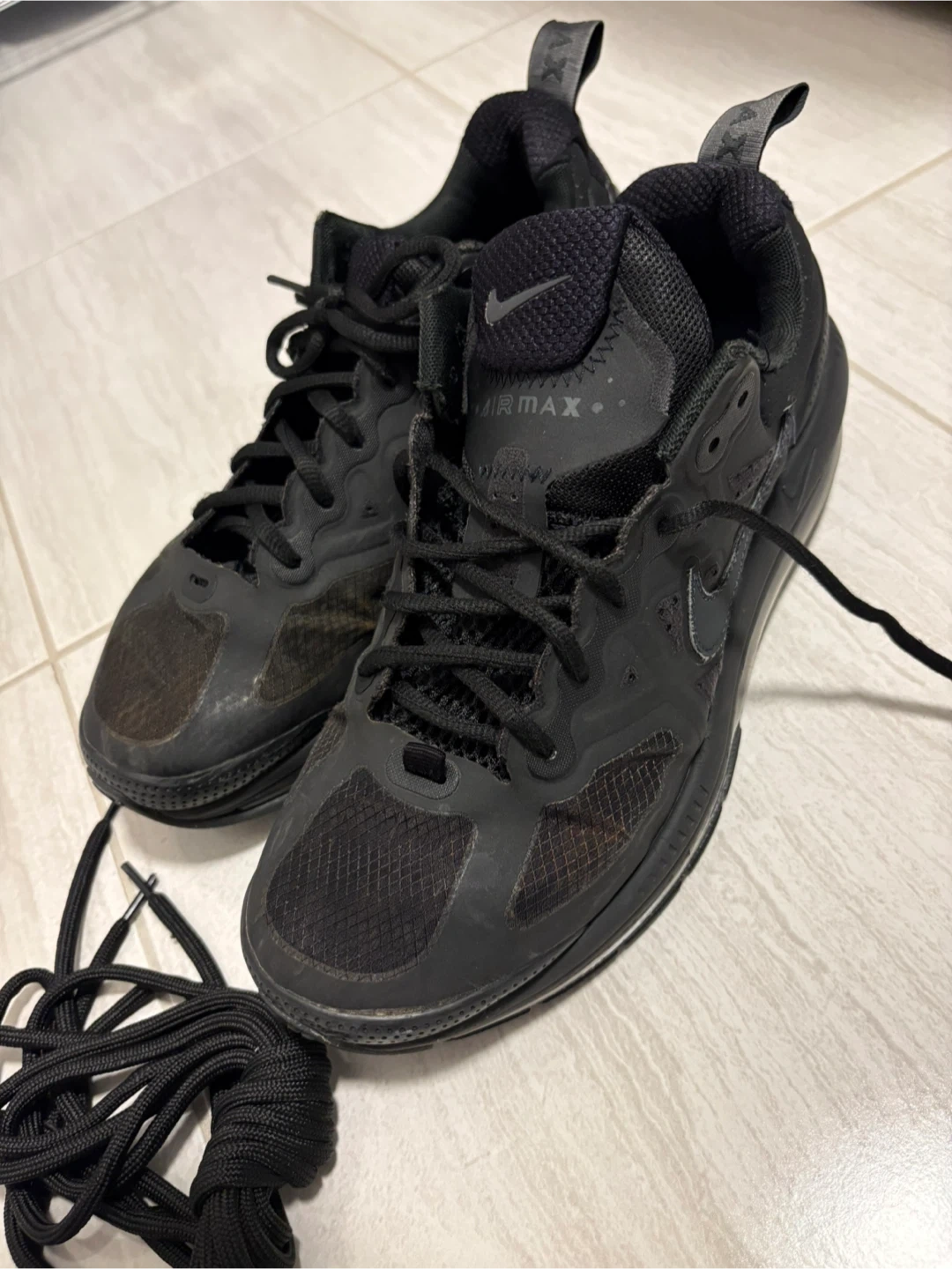 This black Nike Air Max running shoes is designed for comfort and performance. It features a durable construction with mesh uppers and a visible Air Max cushioning unit in the sole. Extra new pair of laces is included. Size 8 men.