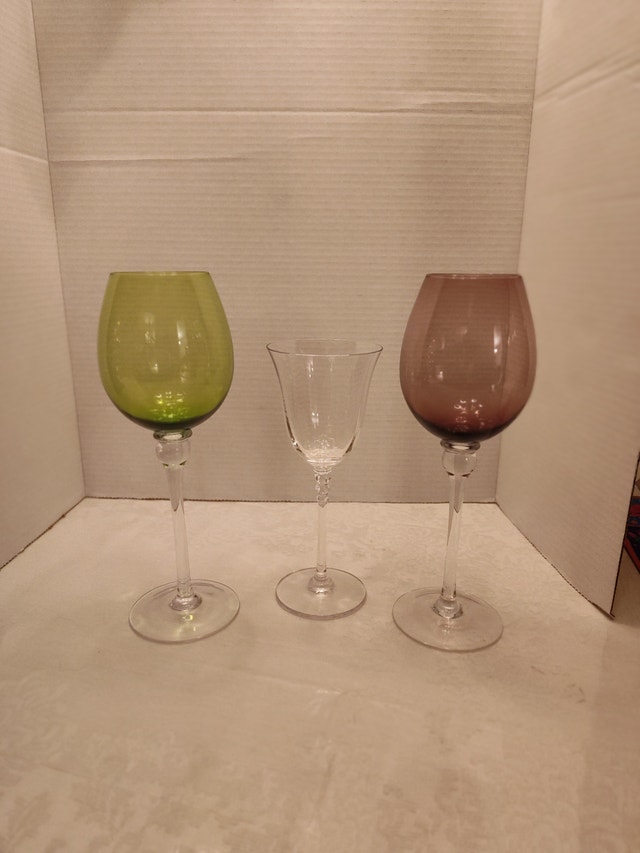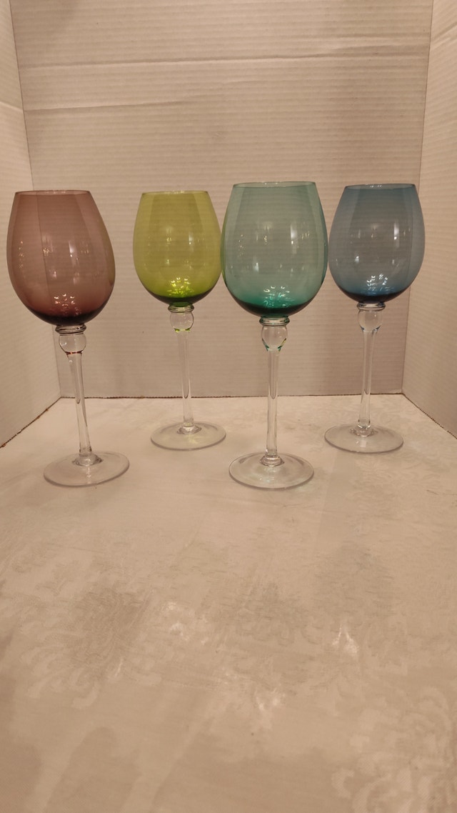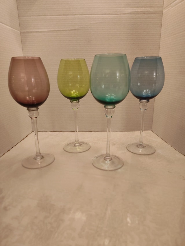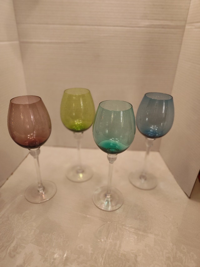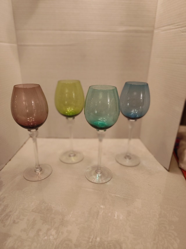 4 Bombay wine glasses in various festive colors. All are in like-new condition and were on display only. Pick up near Britannia Rd and Ninth Line or Winston Churchill Blvd.