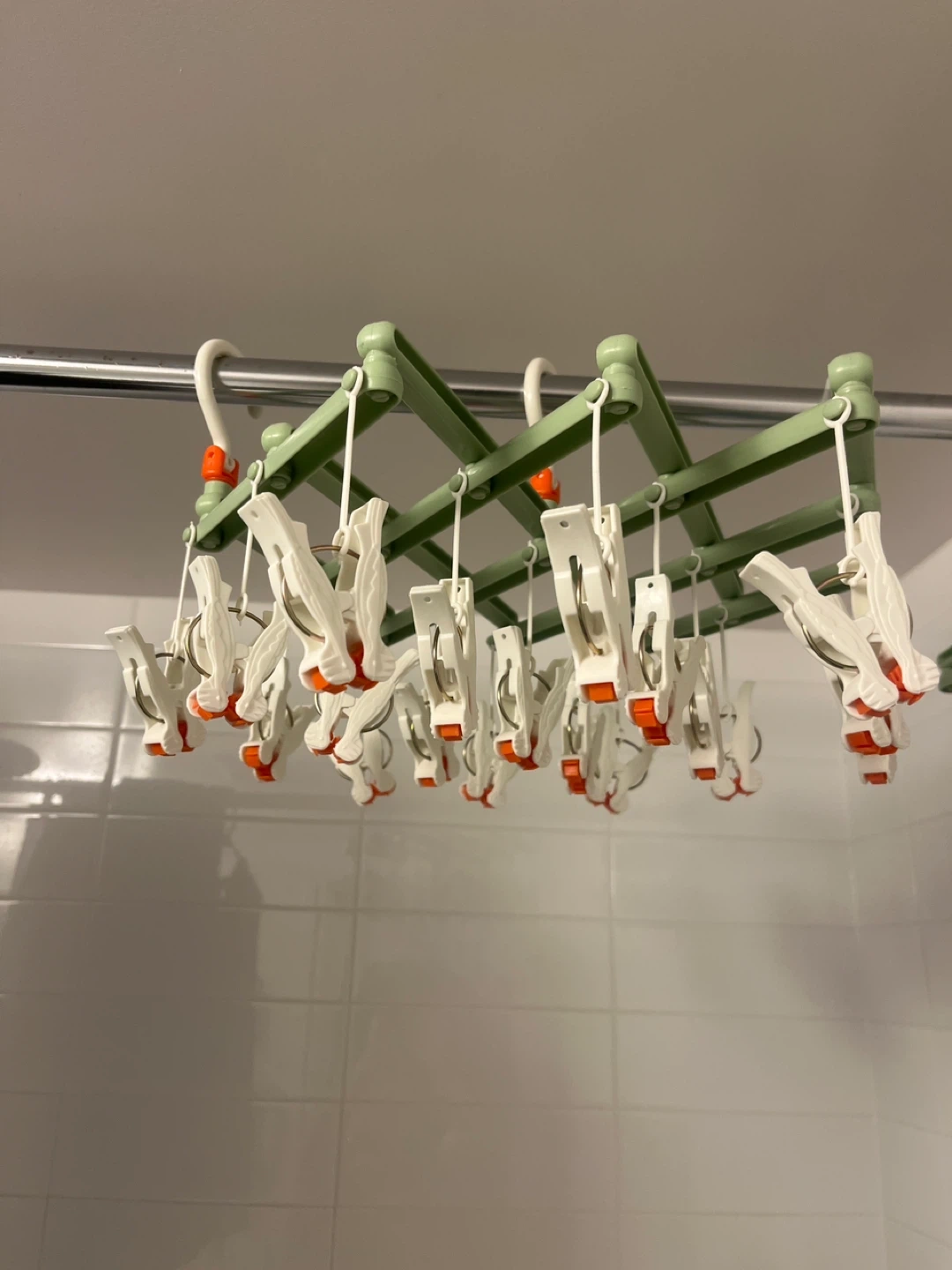 Here's a handy folding clothes drying rack! It comes with a bunch of clips to hold your clothes while they dry. Perfect for saving space and keeping your laundry organized