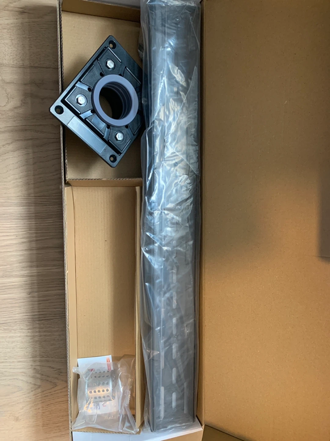 This is a linear shower drain, 24 inches in length. It features a stainless steel construction for durability. The kit includes the drain body and a square base for installation.