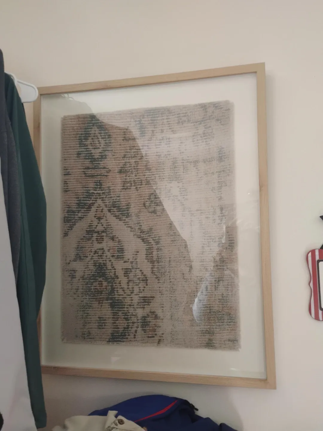 Selling a framed piece of wall art. It features a neutral color palette with a subtle pattern. The frame is a light wood tone, adding a touch of warmth to the piece. It's in good condition and ready to hang in your home