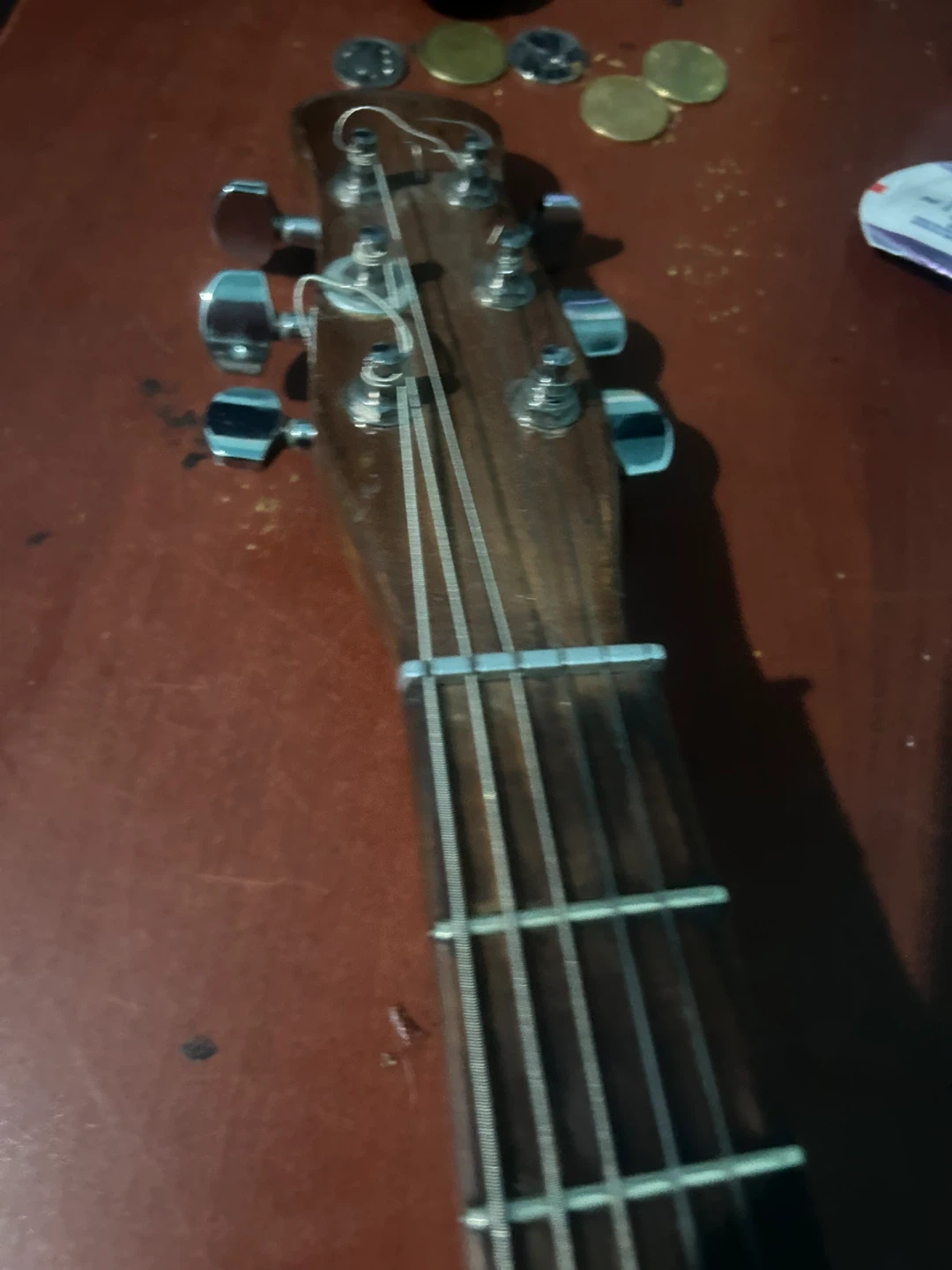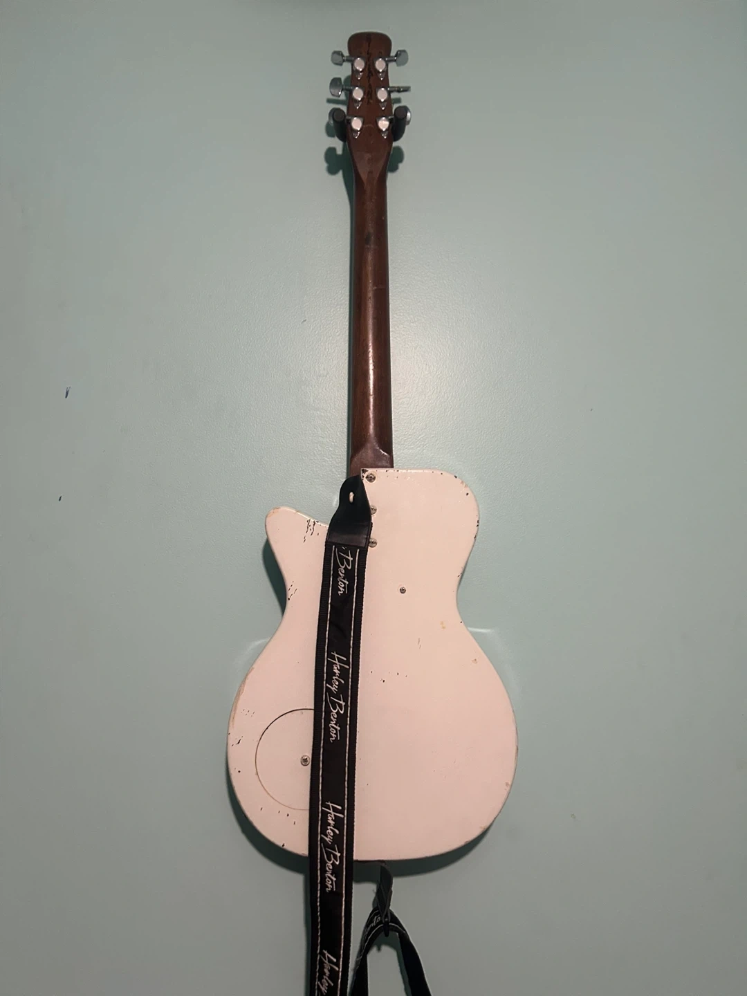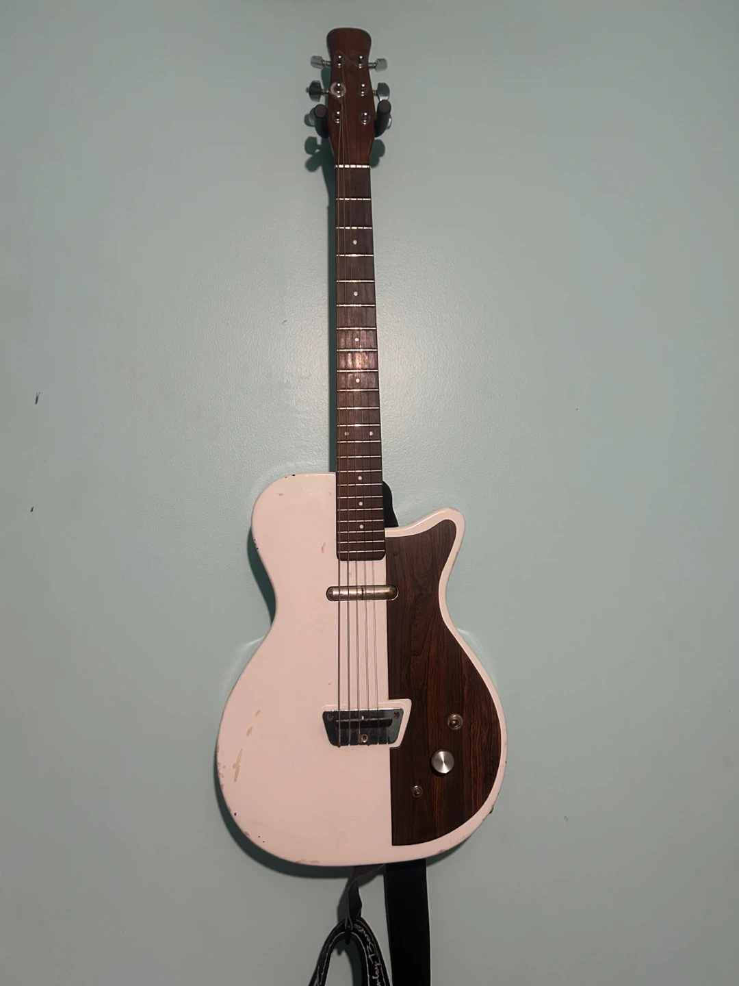 White and wood-grain electric guitar. this guitar has no branding it needs a little work but it can be an amazing guitar with the right kind of work