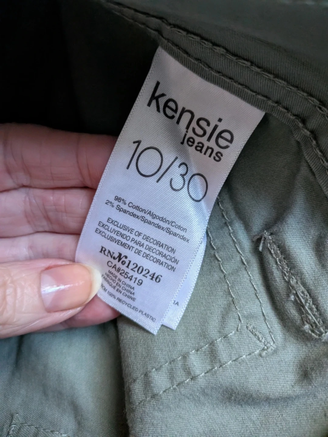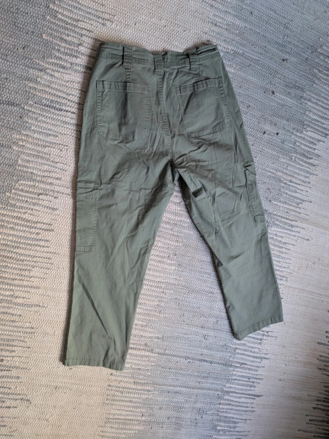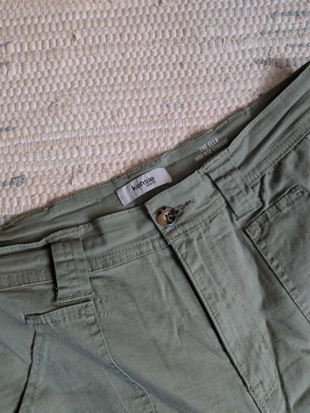 Kensie Jeans cargo pants in a light green colour. These are The Ella style, high rise and straight leg. Cotton blend with 2% Spandex for comfort. Size 10/30. Gently worn