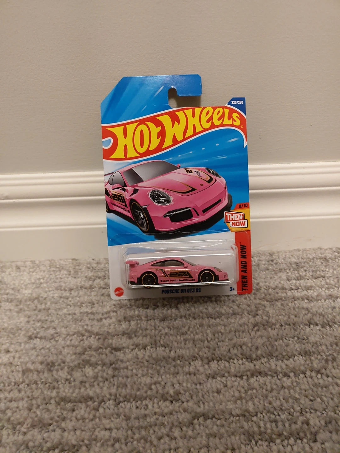 It's a pink Hot Wheels Porsche 911 GT3 RS toy car. Card is in good condition. Great for collectors!
