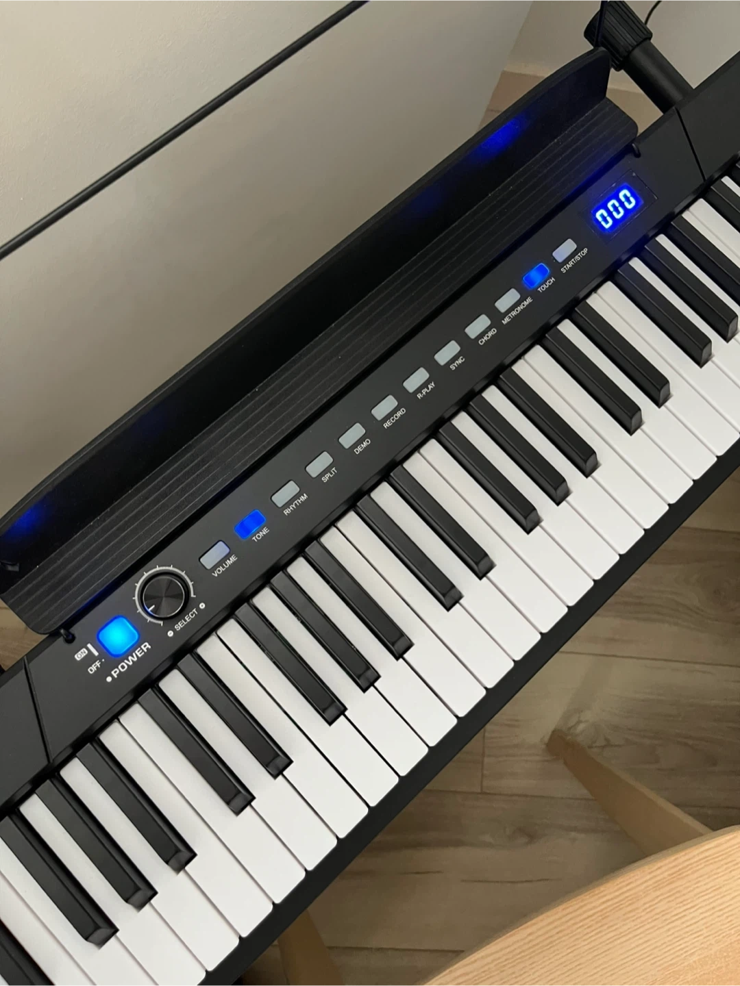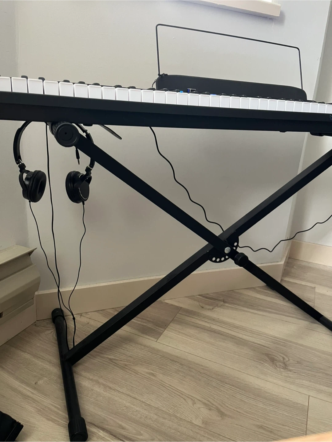 This is a portable electronic keyboard, perfect for beginners or for practicing on the go. It comes with a sturdy stand and a pair of headphones for private practice sessions. The keyboard has various functions and buttons for different tones and rhythms. It's great for learning or casual playing!