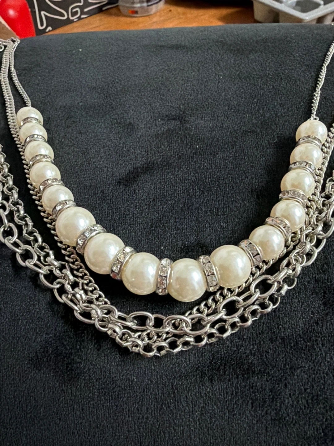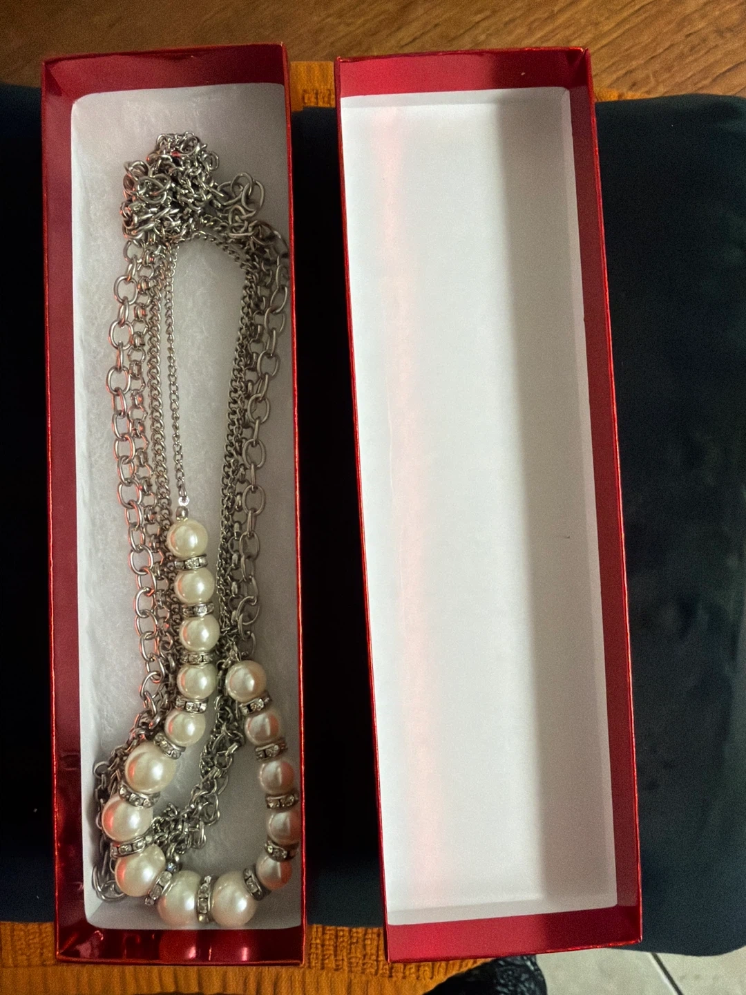 This necklace features multiple silver-tone chains layered with faux pearls and sparkling accents. It comes in a red gift box, ready for gifting or keeping. Its elegant design adds a touch of glamour to any outfit!