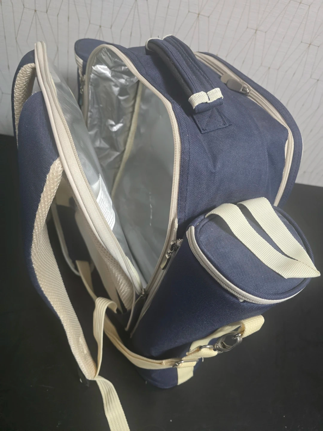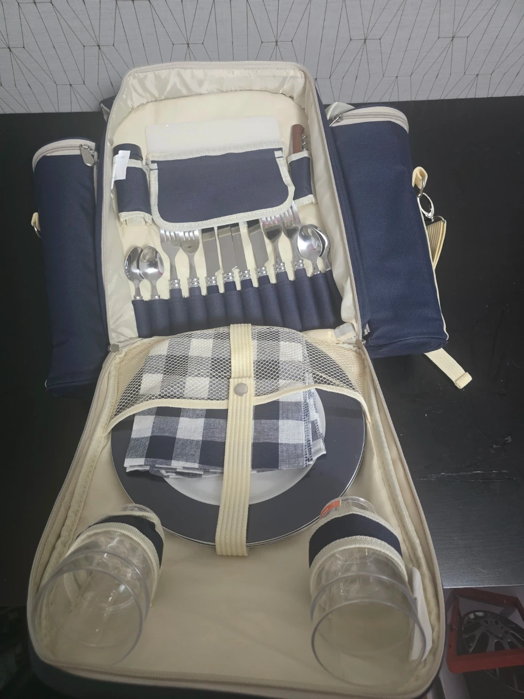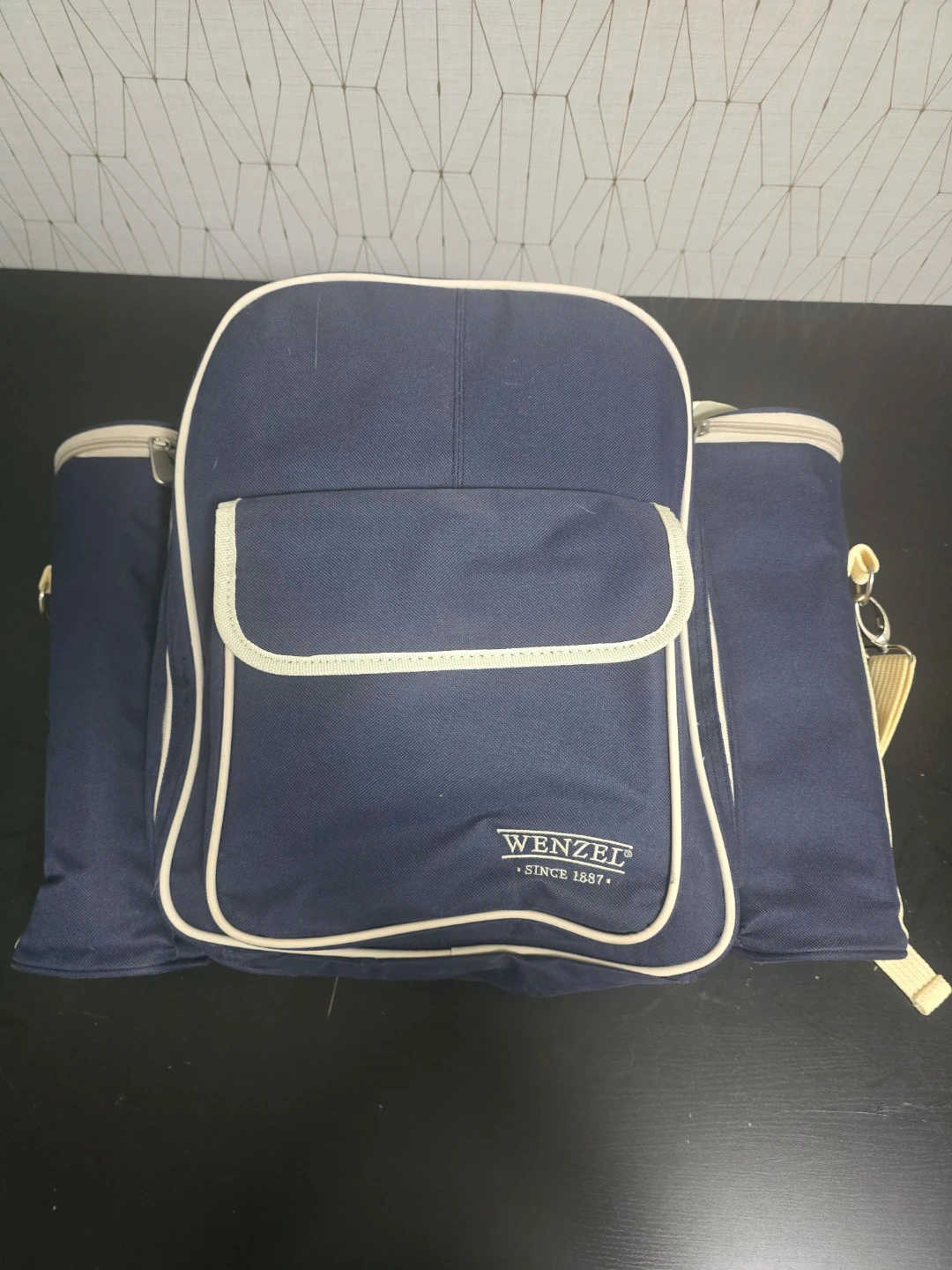 This Wenzel picnic backpack is navy blue with cream trim. It includes plates, cutlery, and cups for four people. It's great for outdoor excursions!