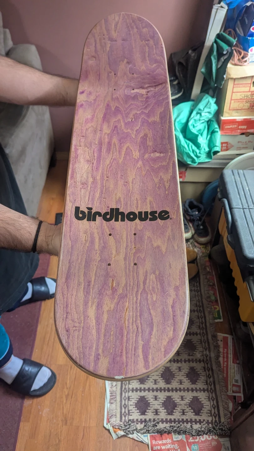 This is a Birdhouse skateboard deck featuring artwork from Tony Hawk's Pro Skater 1+2. The deck has a purple wood grain on the bottom. It's made of durable maple wood.