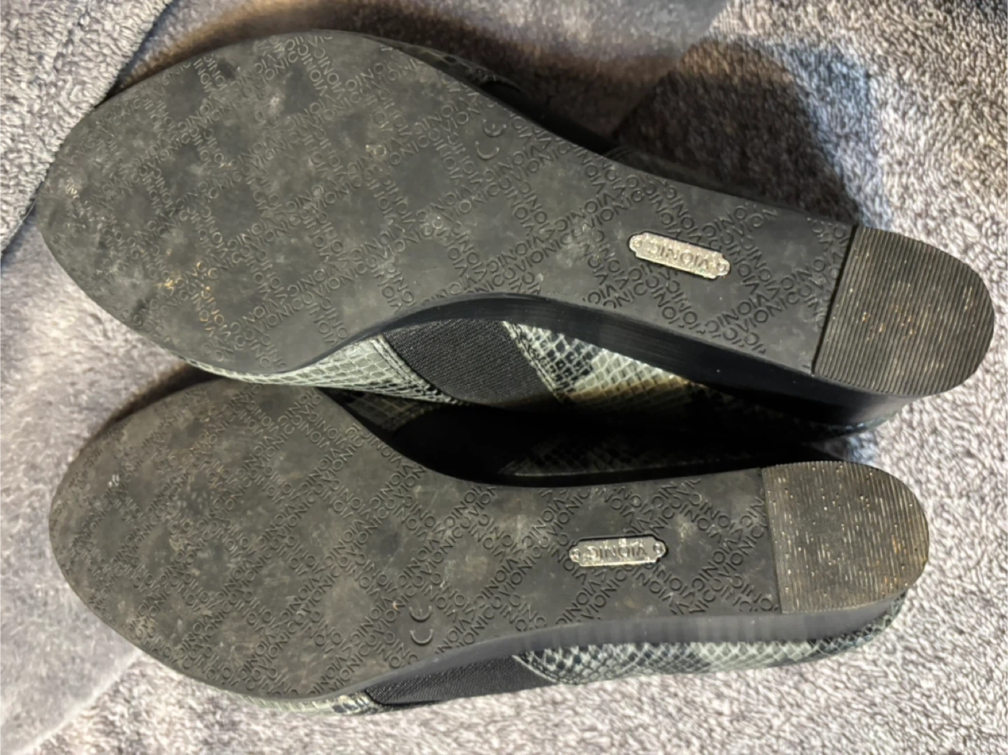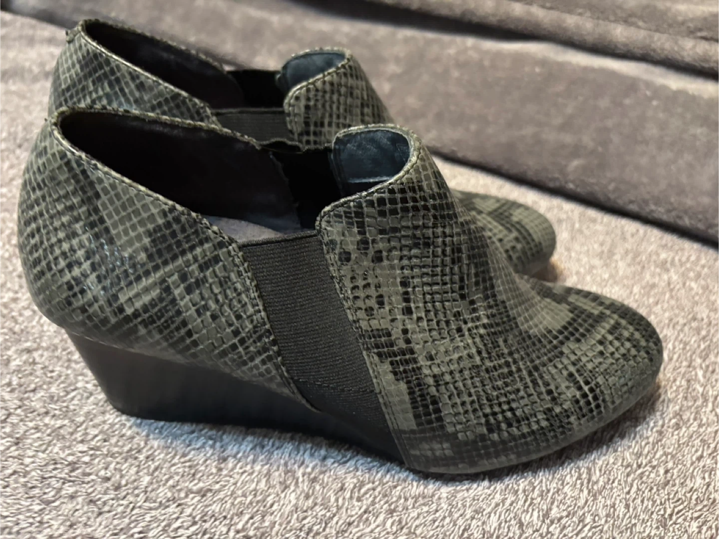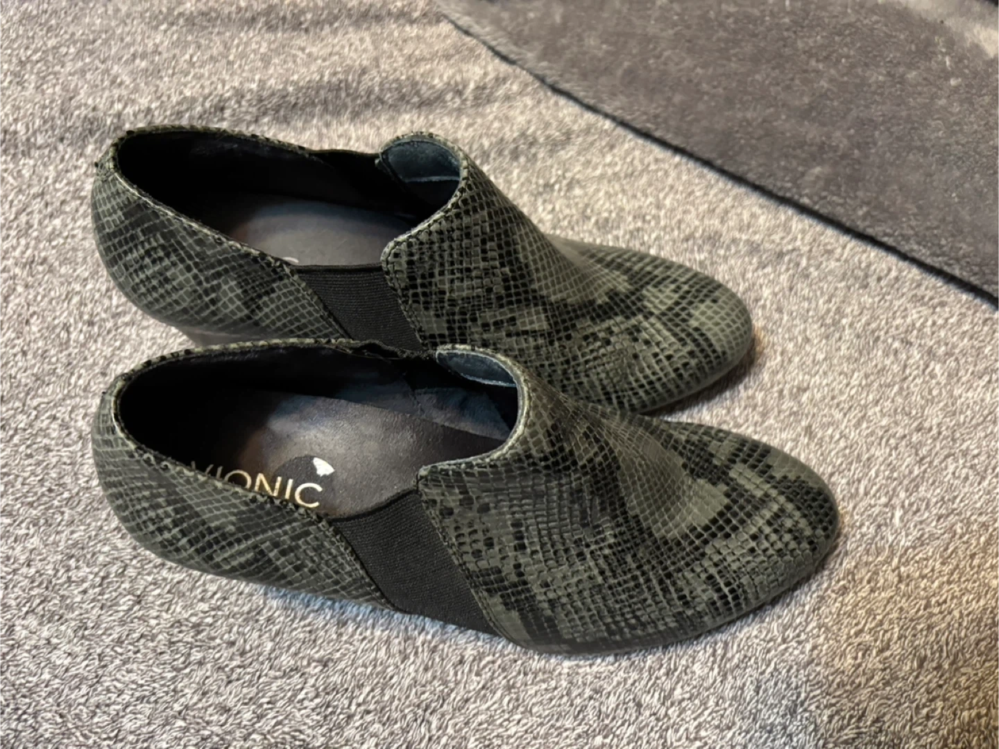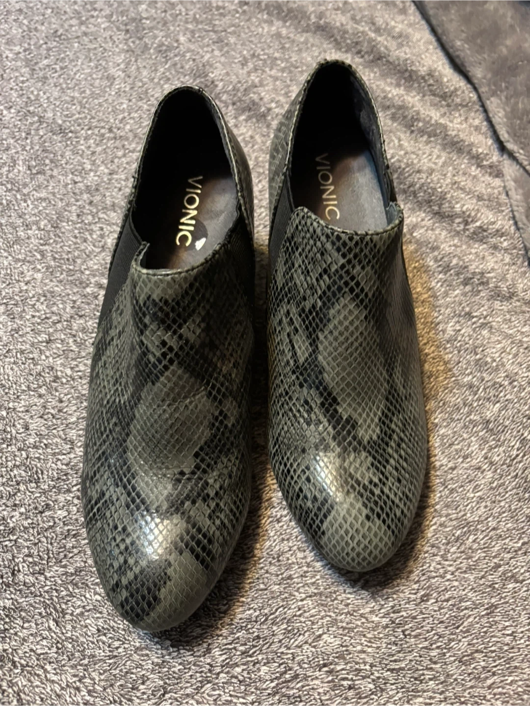 Comfortable Vionic slip-on boots featuring a grey snake print design. These boots have elastic side panels for easy wear. They're great for adding a stylish touch to any casual outfit. Like new