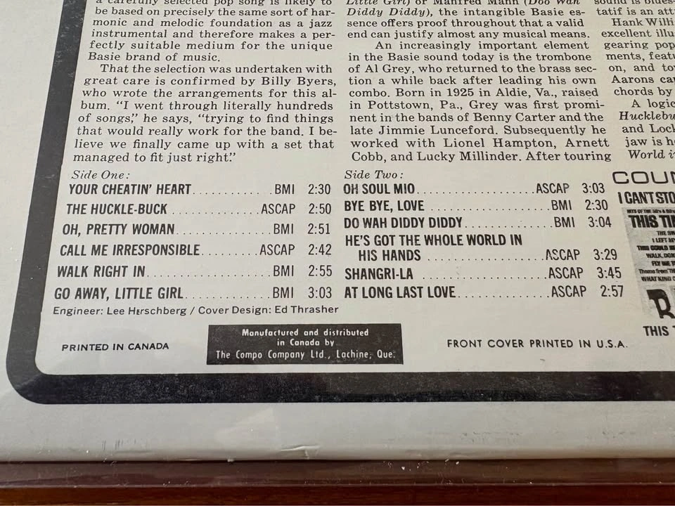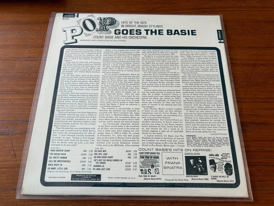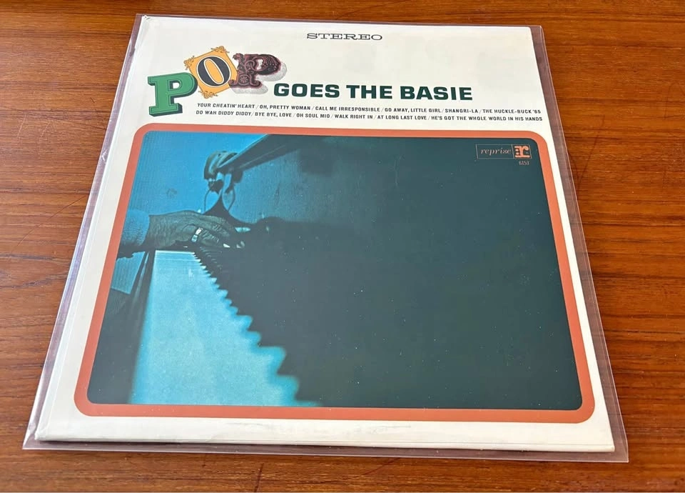 LP record Pop Goes the Basie, a jazz record by pianist and bandleader Count Basie and his orchestra. Recorded in 1964 and released in 1965 by Reprise Records, the album features jazz interpretations of then-contemporary popular hits. This vinyl is in remarkable shape. Pickup only in Burlington. Firm on price.