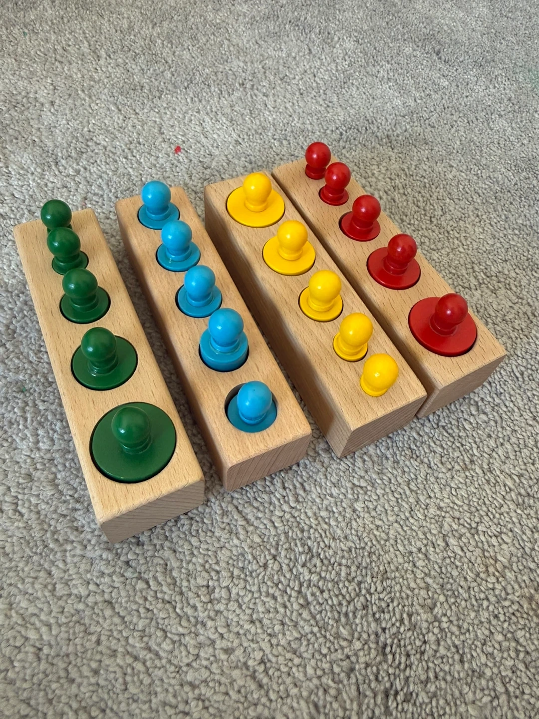 These wooden cylinder push down toys are great for developing fine motor skills. They come in a set of four blocks with various sized cylinders. Perfect for little hands to grasp and manipulate!