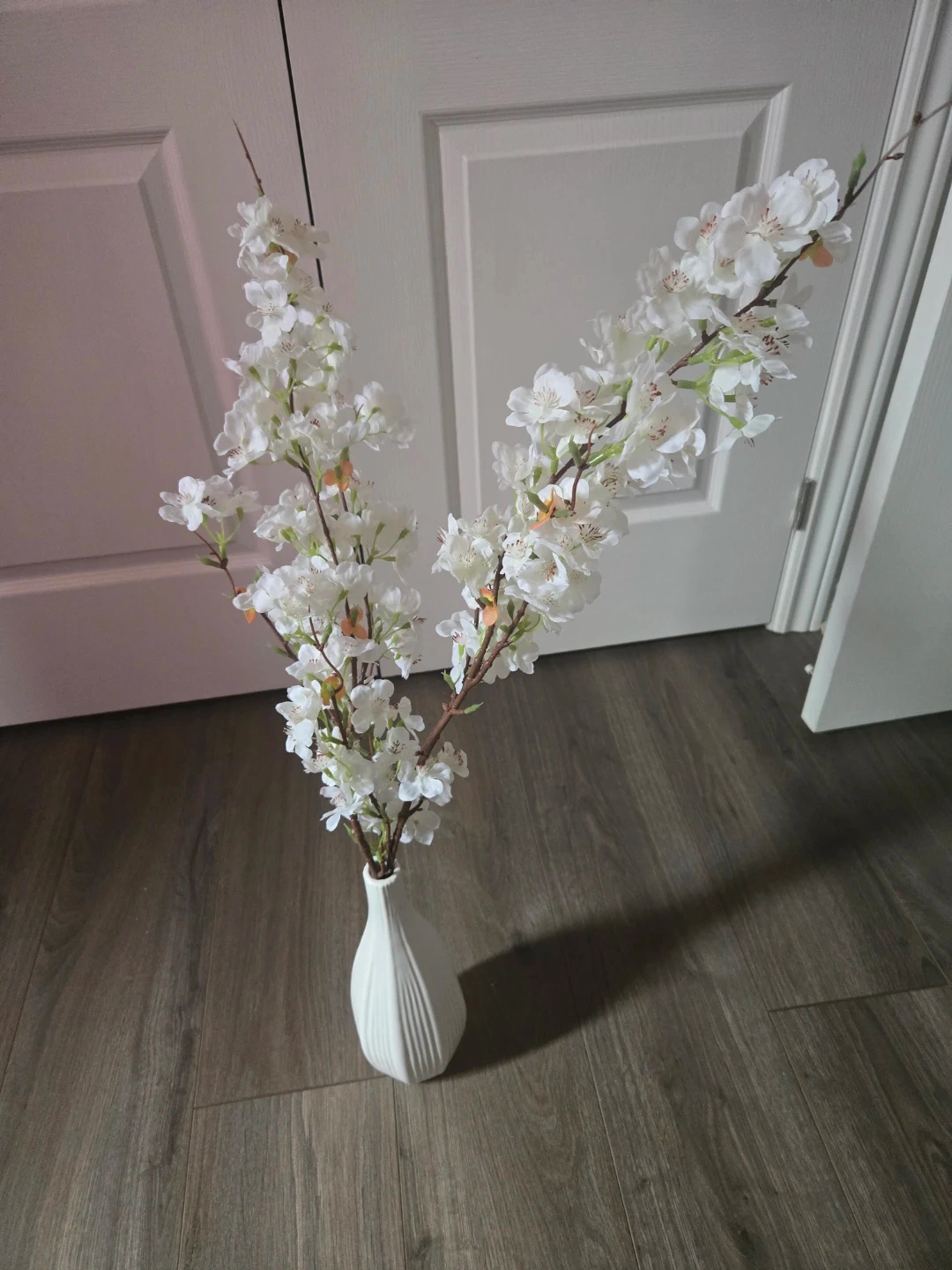 These are artificial cherry blossom branches with white flowers in a fluted white vase. The branches are a delicate white with hints of pink and green. They're perfect for adding a touch of spring to any room.