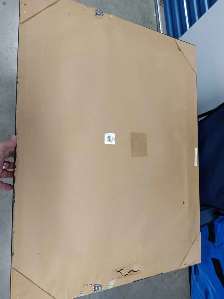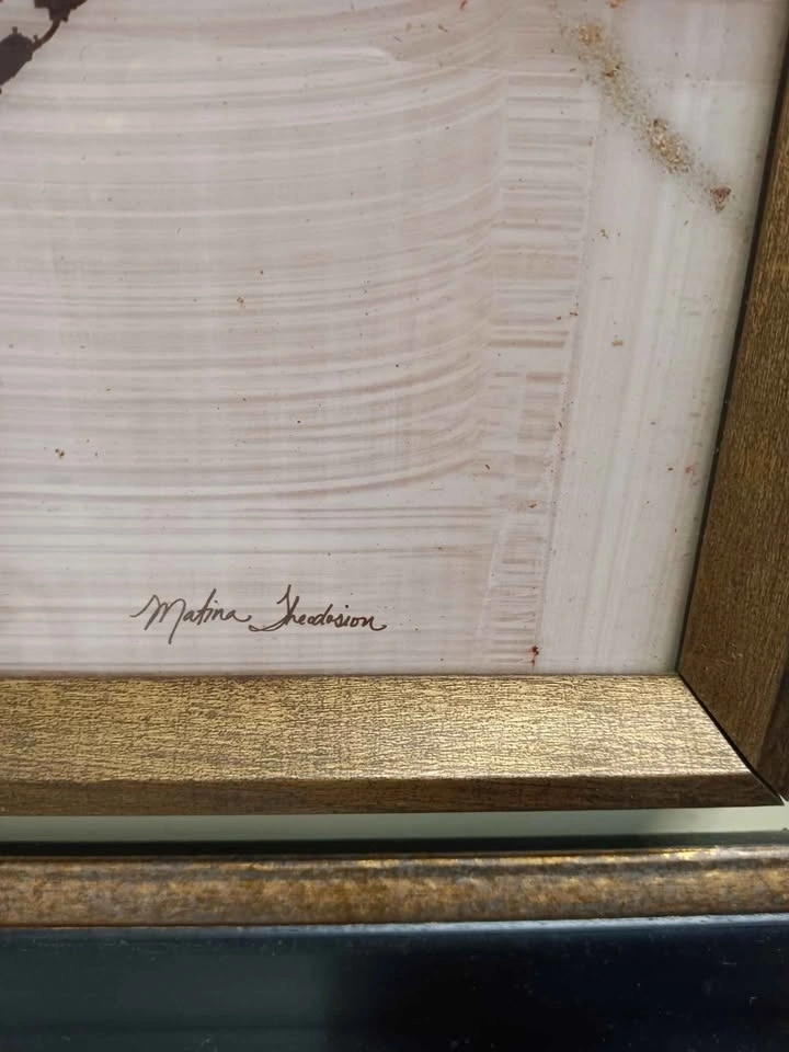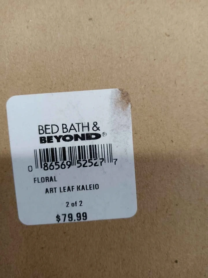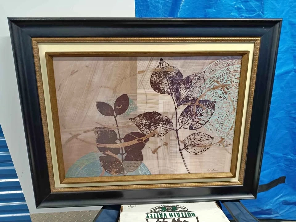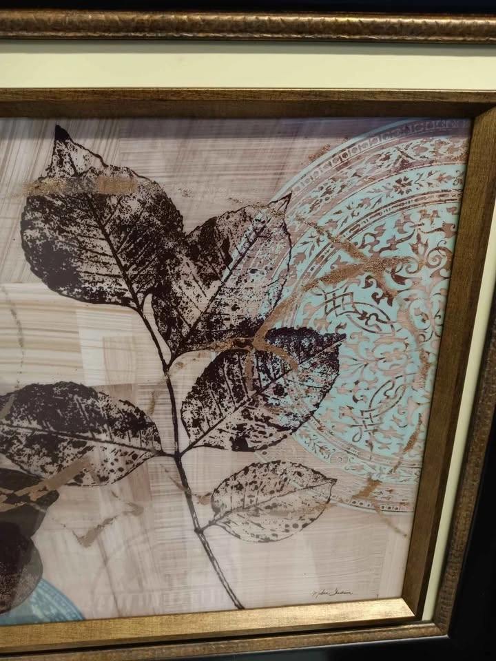 Framed artwork with a leaf design on a beige background and a blue and brown pattern, in a black frame with a gold inner frame. Pick up at CubeSmart storage 7940 Cooper avenue Glendale New York 11385.