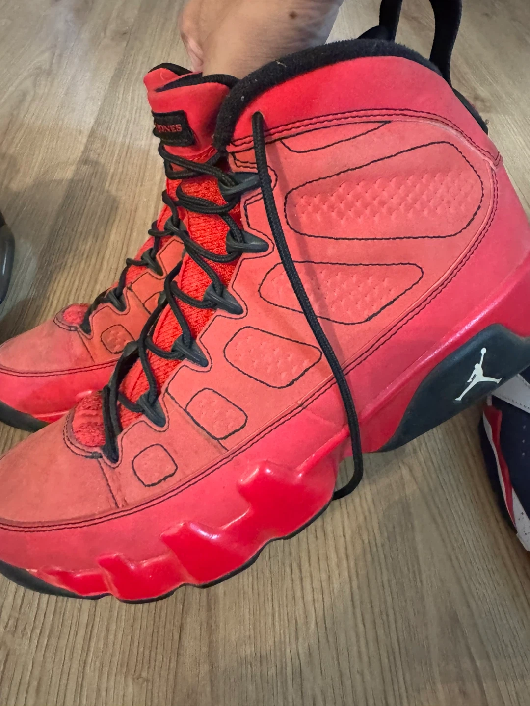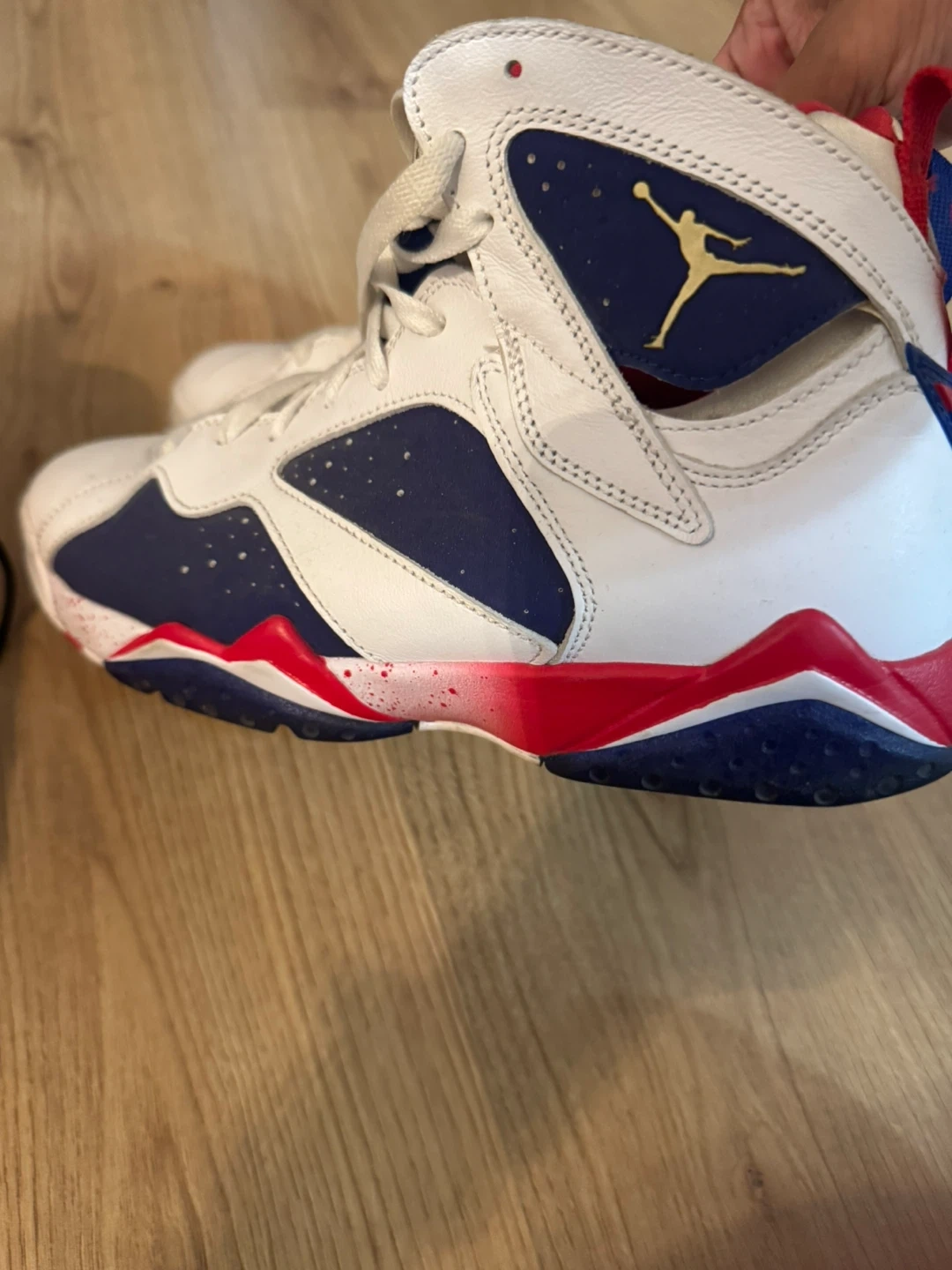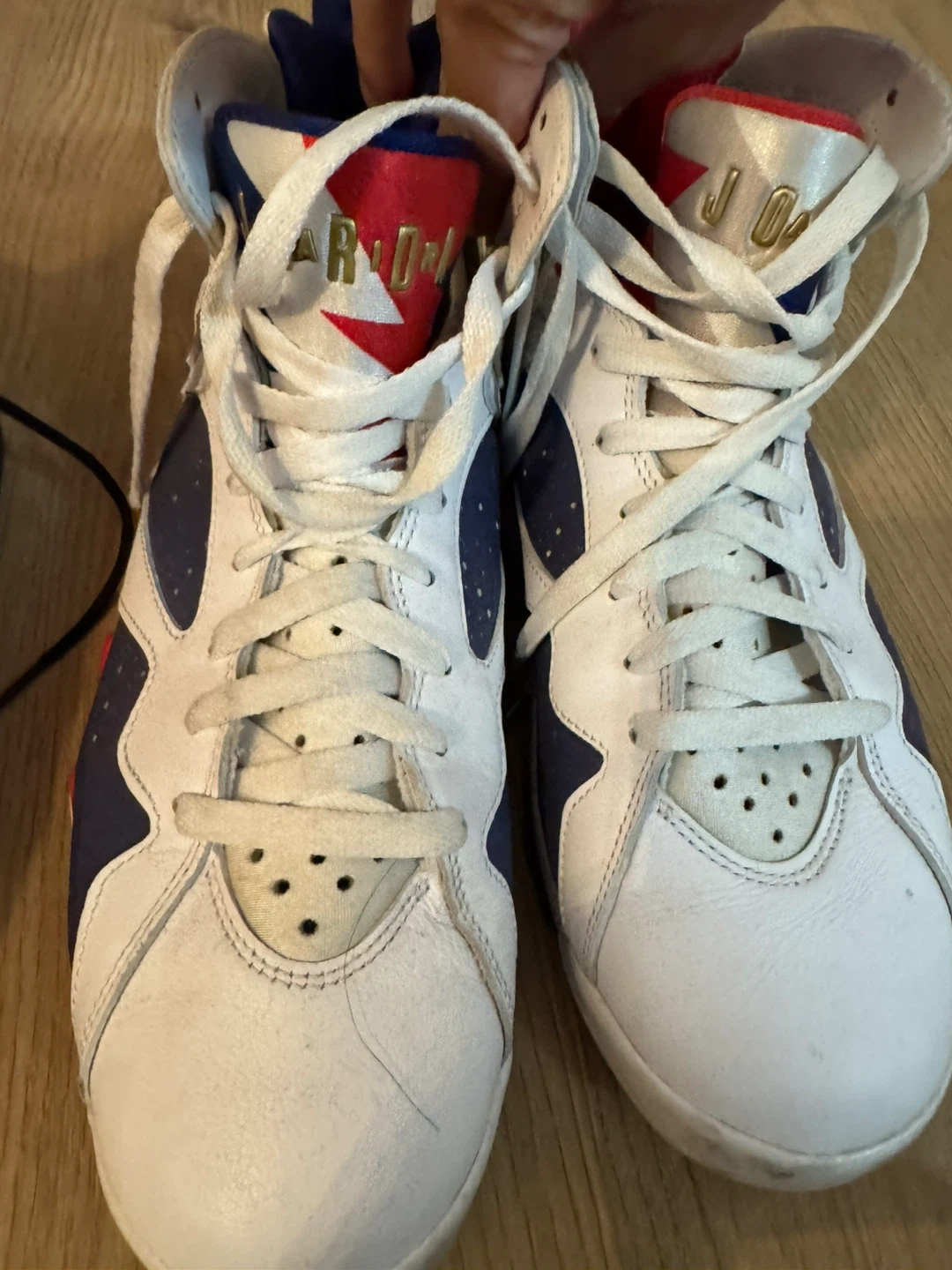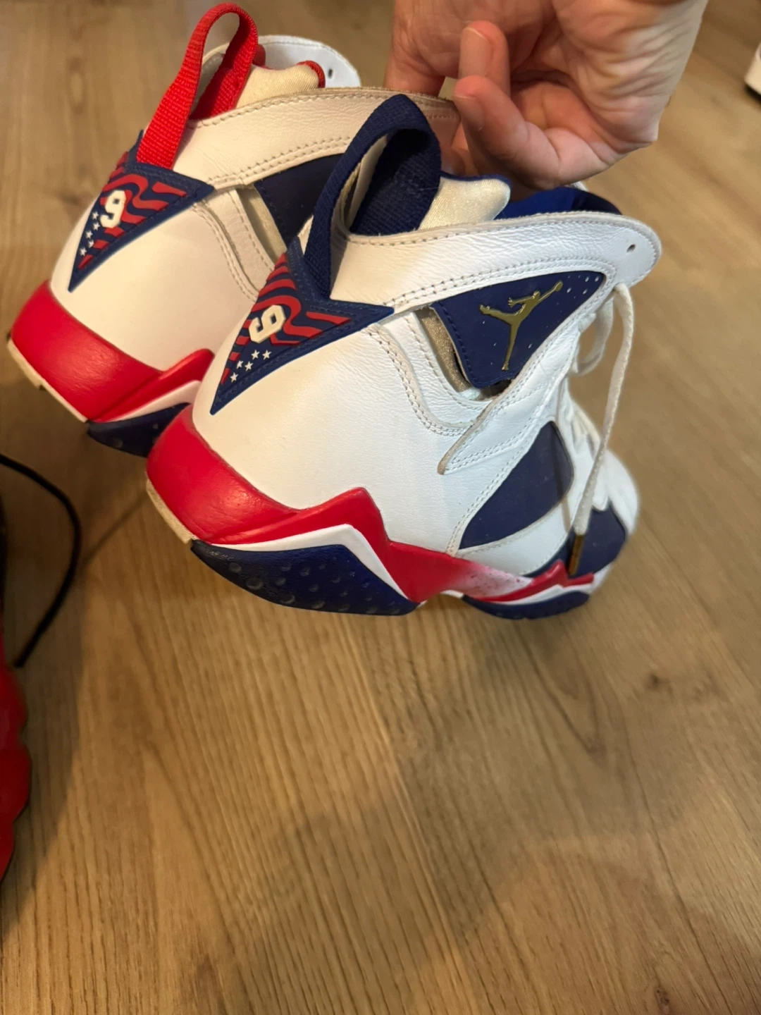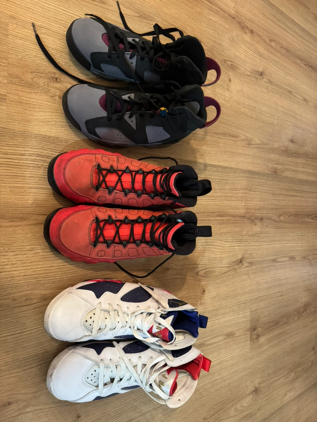 A collection of Air Jordan sneakers. Features the Air Jordan 7 VII "USA Olympic" and the Air Jordan 9 IX "motorboat jones” and the jordan 7 bourdeux” all in size 9 and authentic
