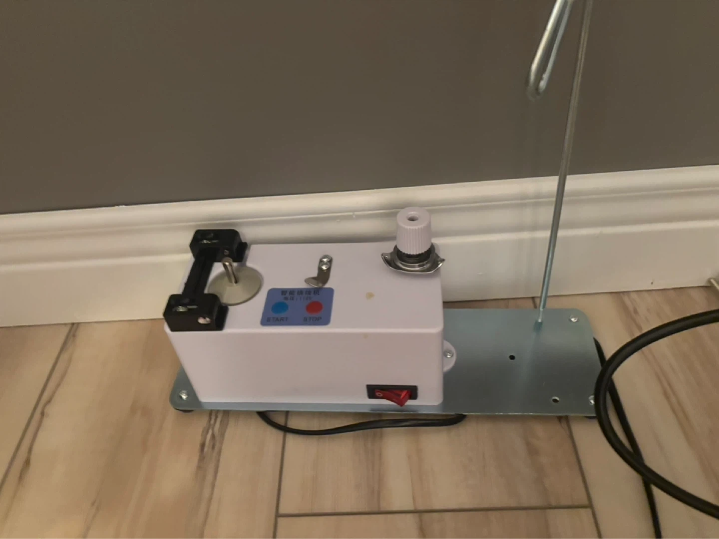 This is an automatic bobbin winder. It's white and comes with a metal base. The winder has start and stop buttons for easy operation. It's perfect for quickly filling bobbins for sewing projects.