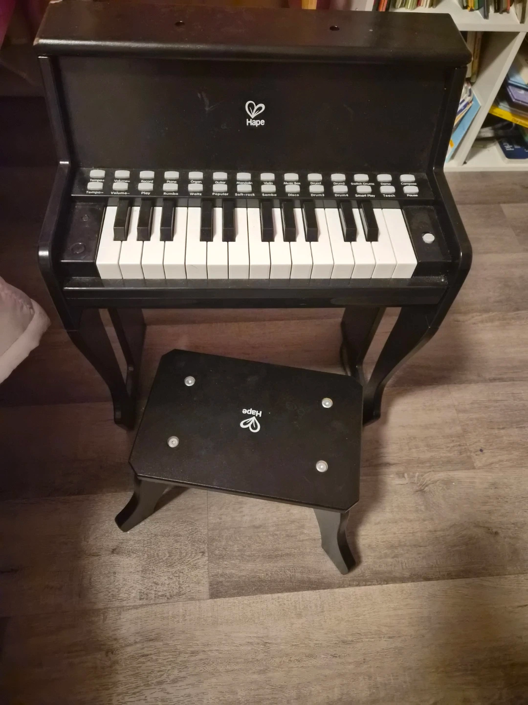 This Hape wooden piano set is perfect for young musicians. It features a black piano with various instrument sounds and a matching stool. Great for developing musical interest!