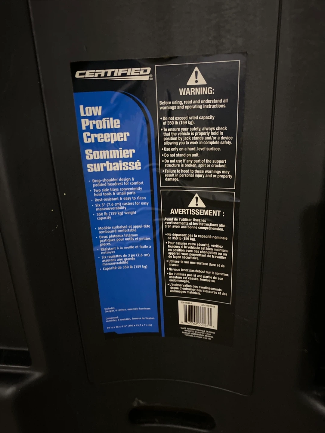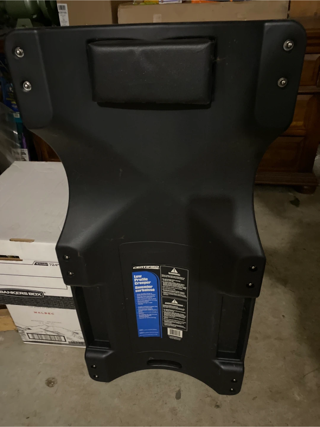 $50- This Certified low profile creeper features a drop shoulder design and padded headrest for comfort. It has six smooth-rolling casters for easy movement. Weight capacity is 350 lb (159 kg).