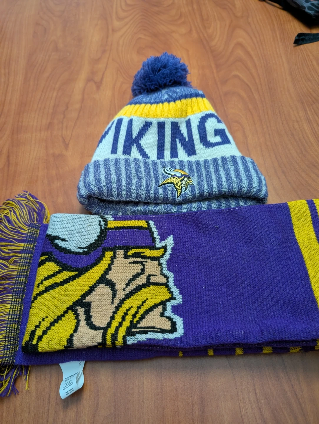This set includes a knit beanie with a pom and a matching scarf. Both items feature the Minnesota Vikings logo and colours. Perfect for any fan to stay warm!