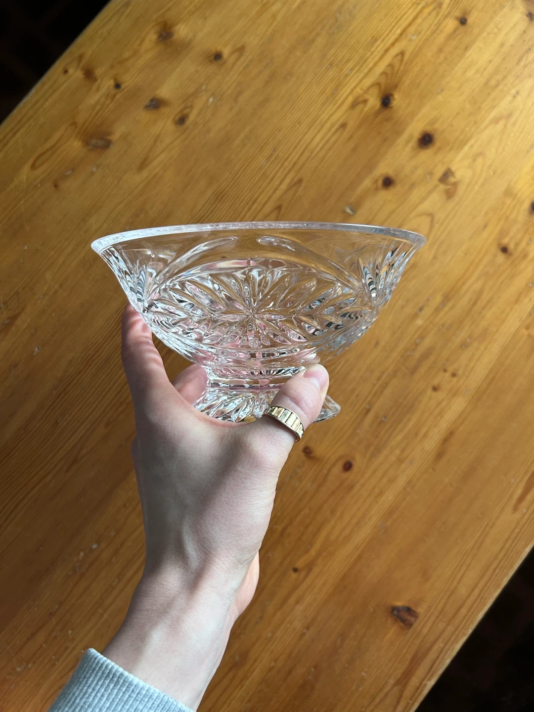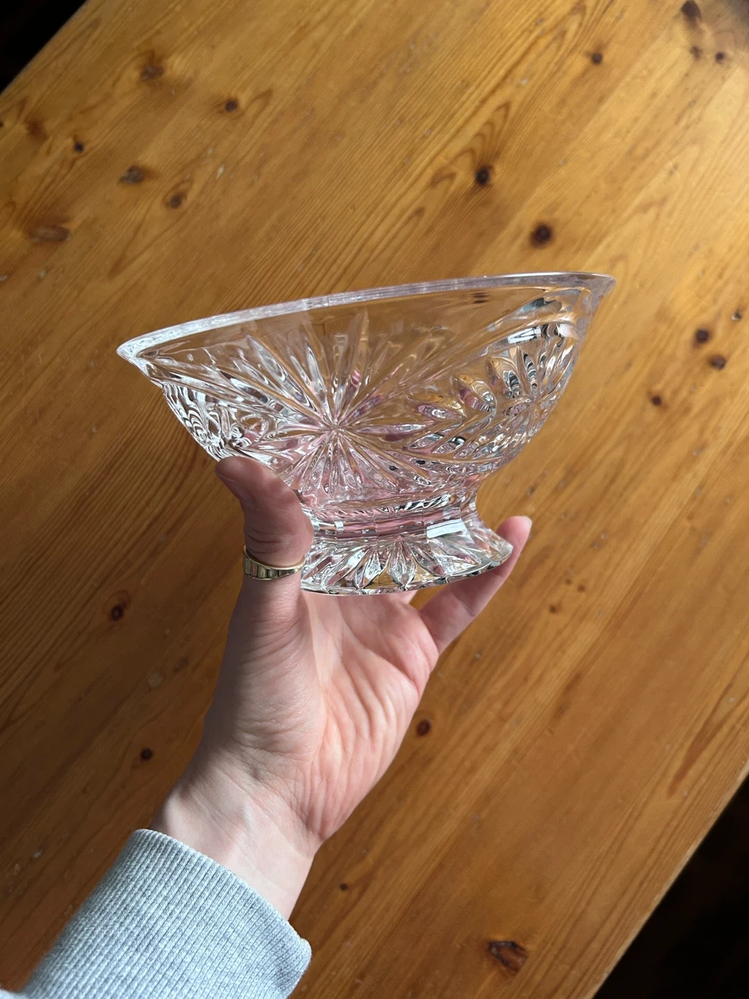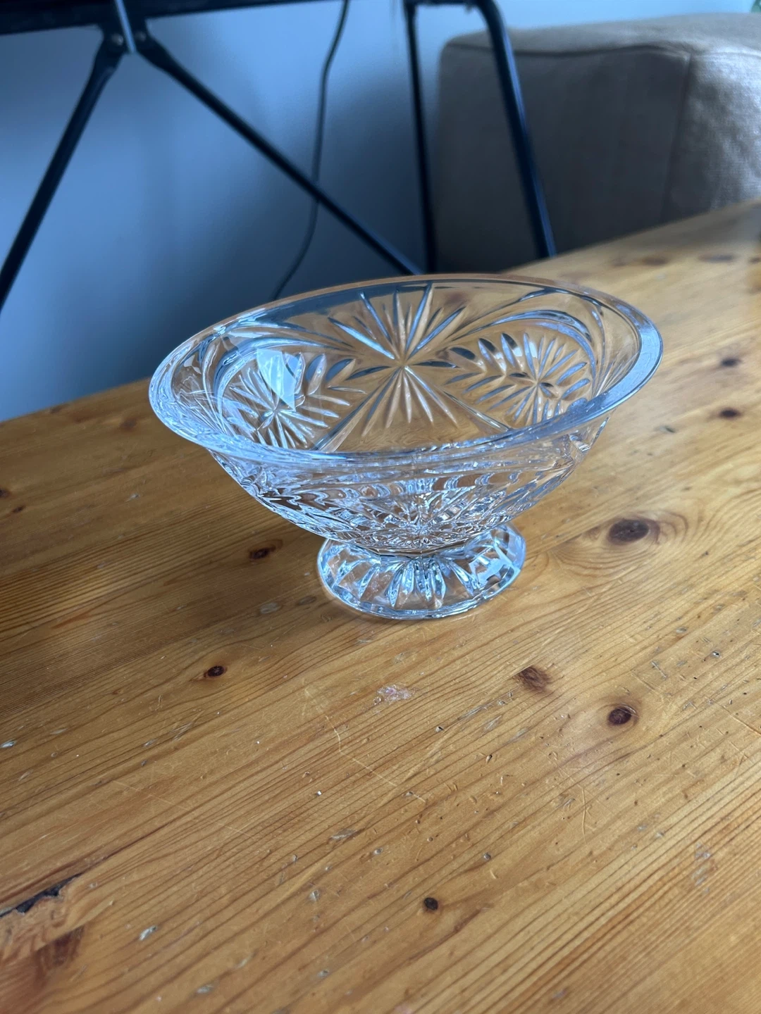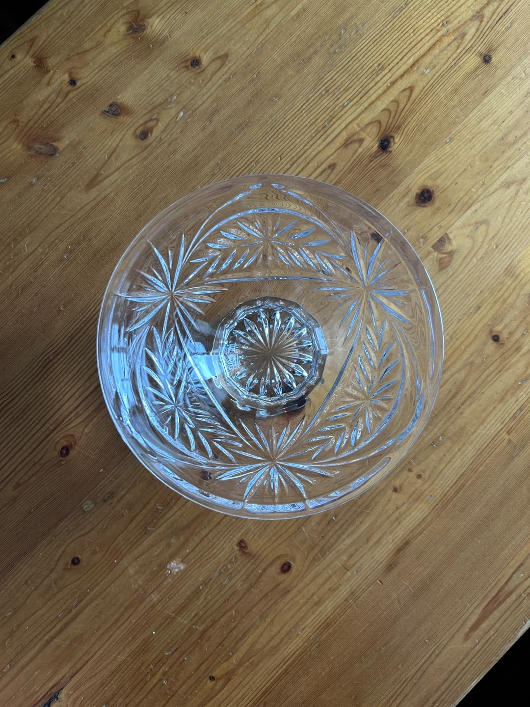 This is a beautiful crystal serving bowl. It features an ornate starburst pattern etched into the glass. Its elegant design makes it suitable for serving desserts or as a decorative centerpiece.