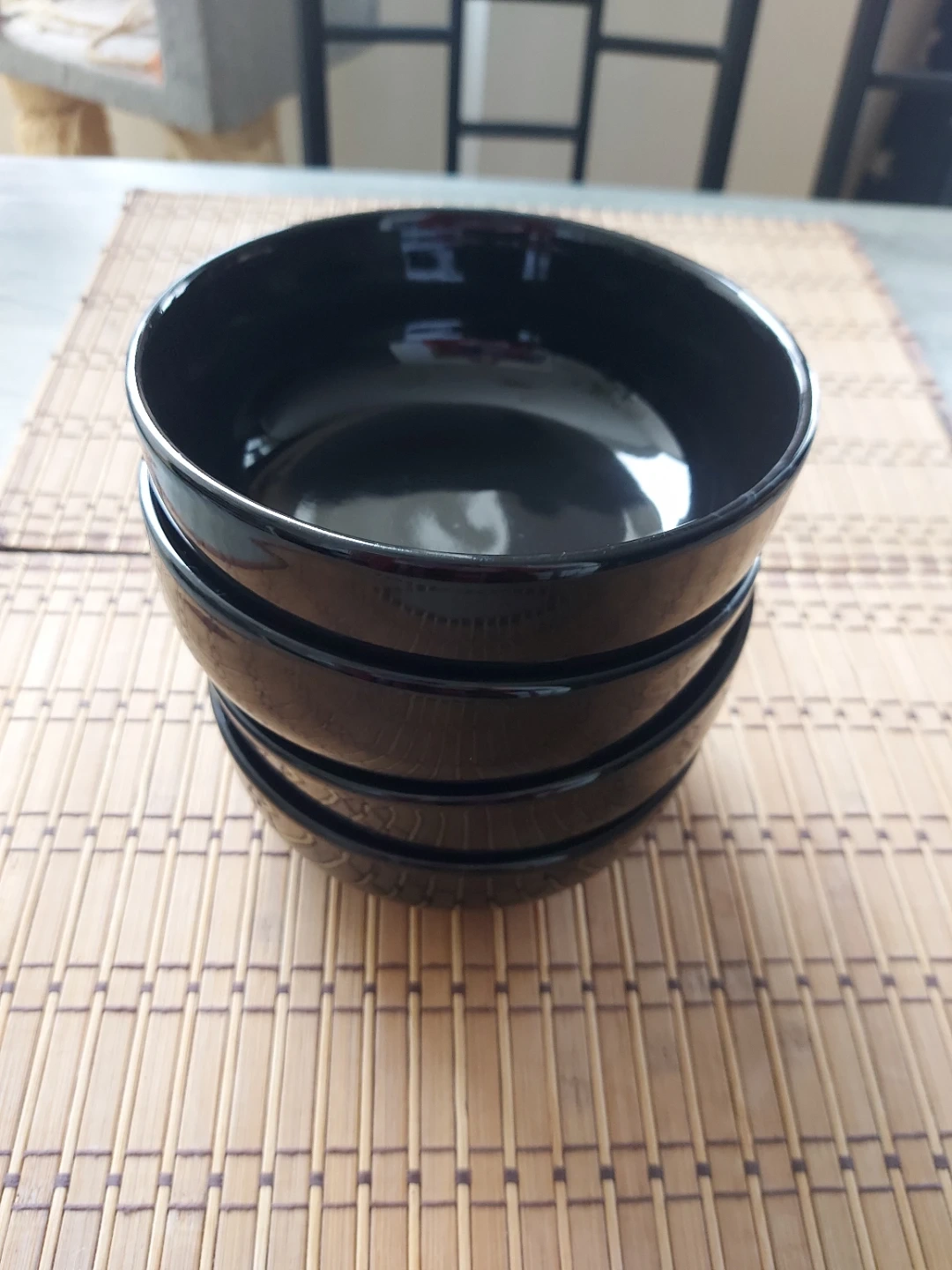 Selling a set of four Mainstays bowls in black. They're dishwasher and microwave safe, perfect for everyday use. Made in China