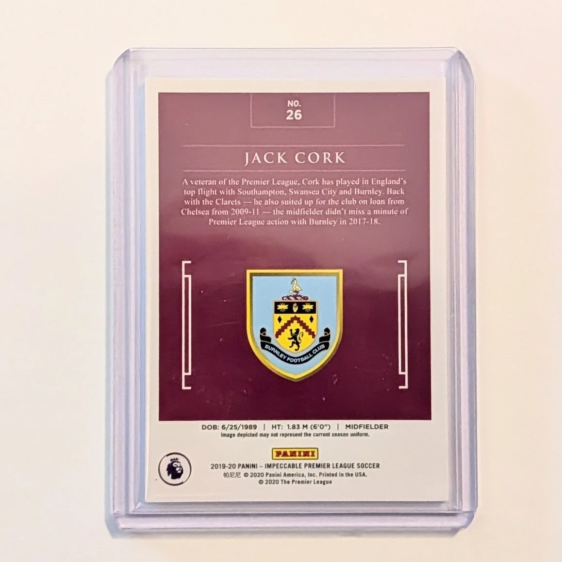 This is a stunning Silver parallel from the inaugural release of Panini Impeccable Premier League. Impeccable is known for its high-end production, featuring thick card stock and a premium matte finish with silver foil accents. Limited to only 35 copies worldwide, this card is a must-have for Burnley team collectors or Jack Cork completionists.