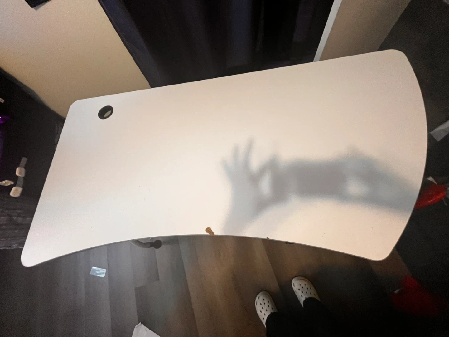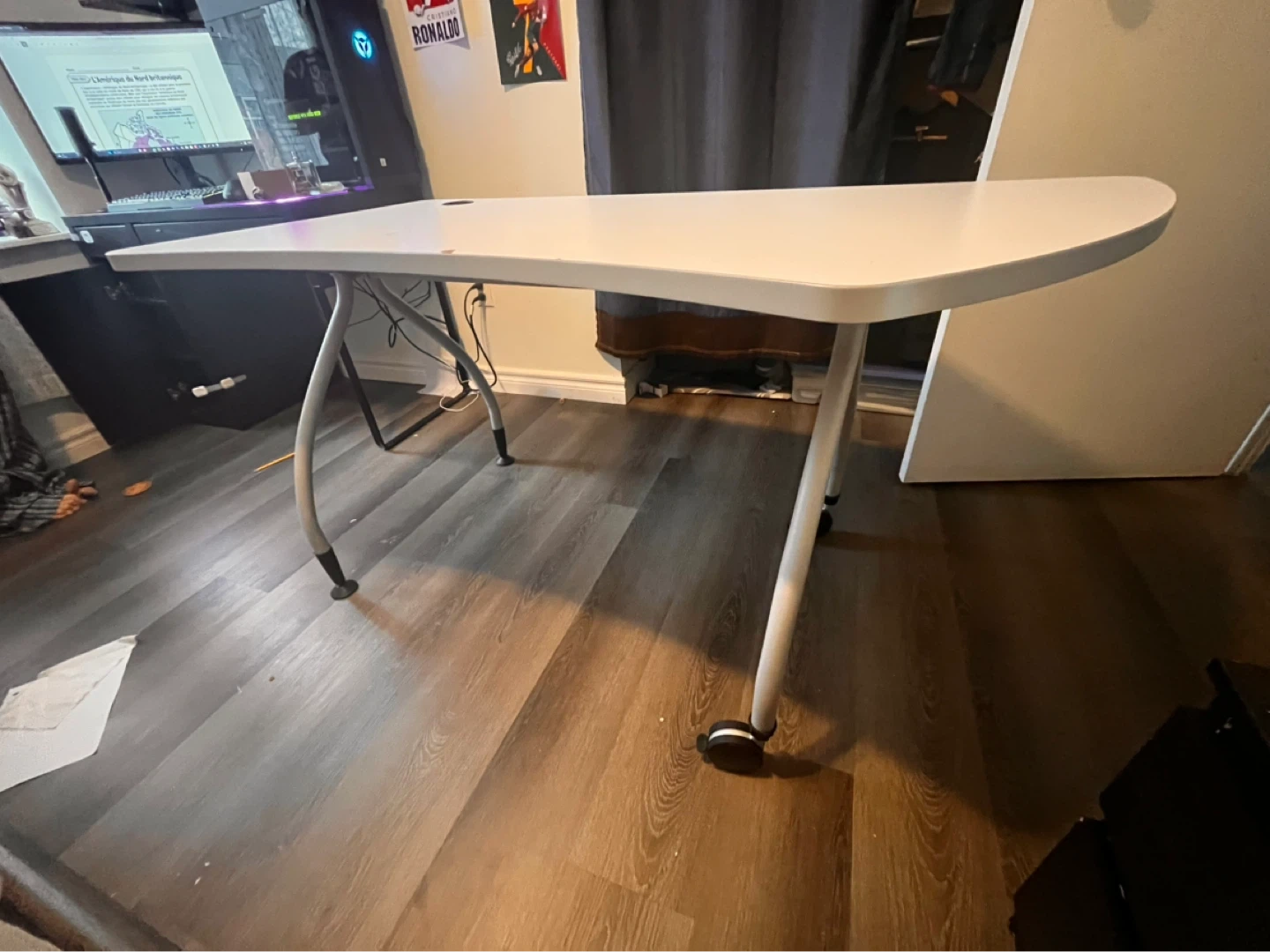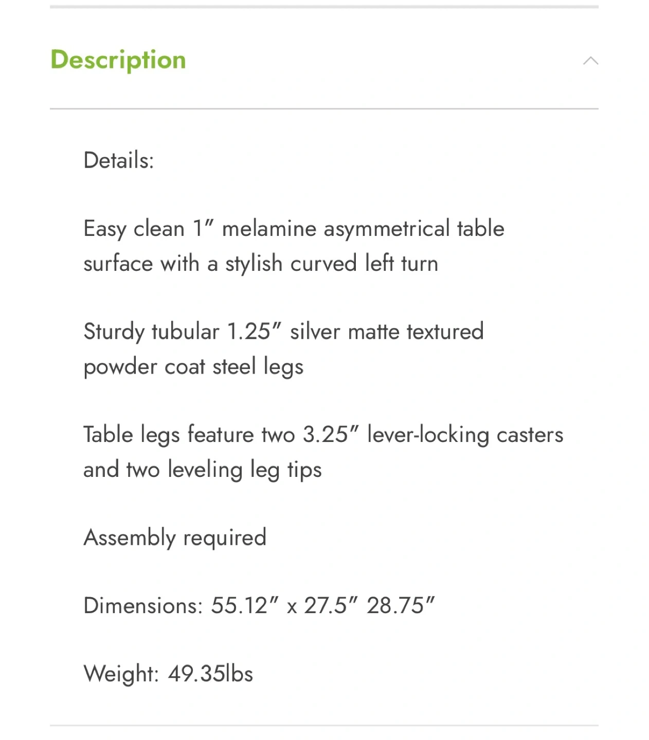 This Samsonite work table has an easy-clean 1" melamine surface with a stylish curved left turn. It's got sturdy tubular 1.25" silver matte textured powder coat steel legs. The table legs have two 3.25" lever-locking casters and two leveling leg tips. Assembly is required.