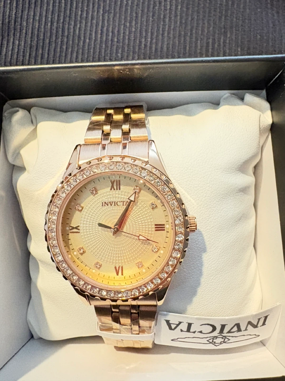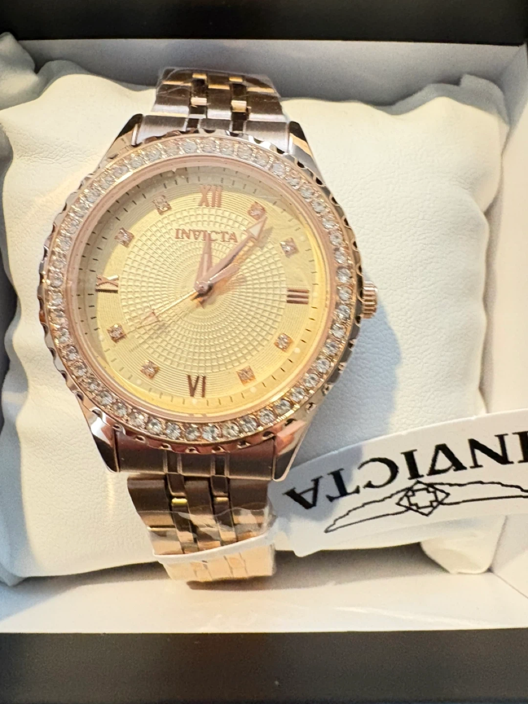 Invicta Wildflower women's watch. Rose gold tone with a champagne dial. Features a 33mm case size and a crystal bezel. Includes original packaging.