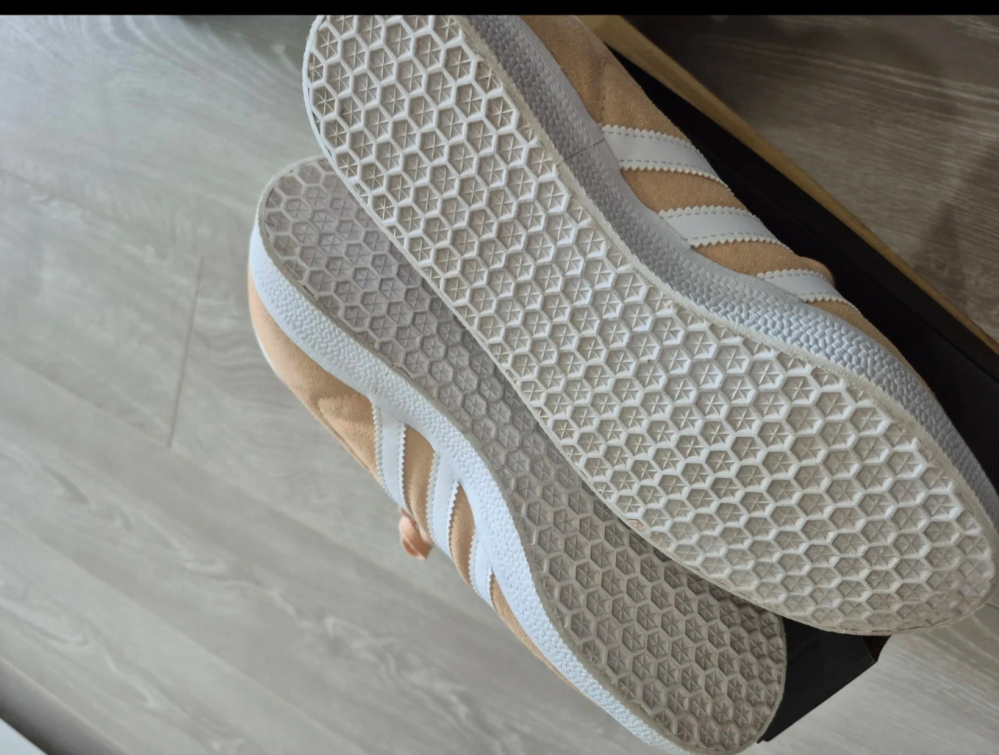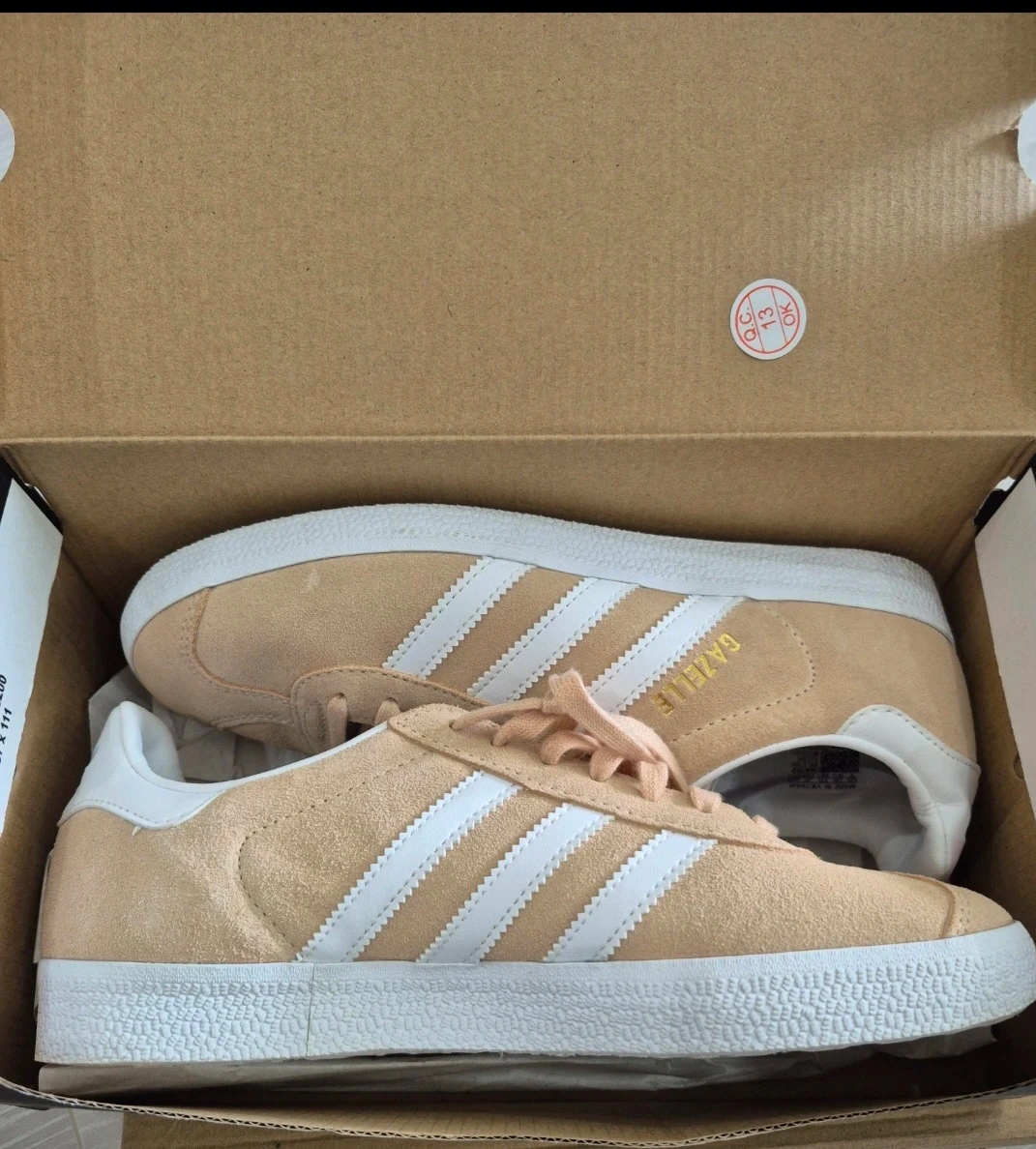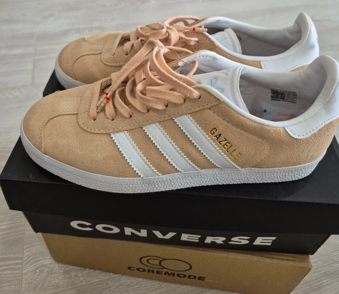 Adidas Gazelle sneakers in a soft peach colour. Suede upper with white stripes. Comes with original box. These are a classic silhouette for everyday wear!