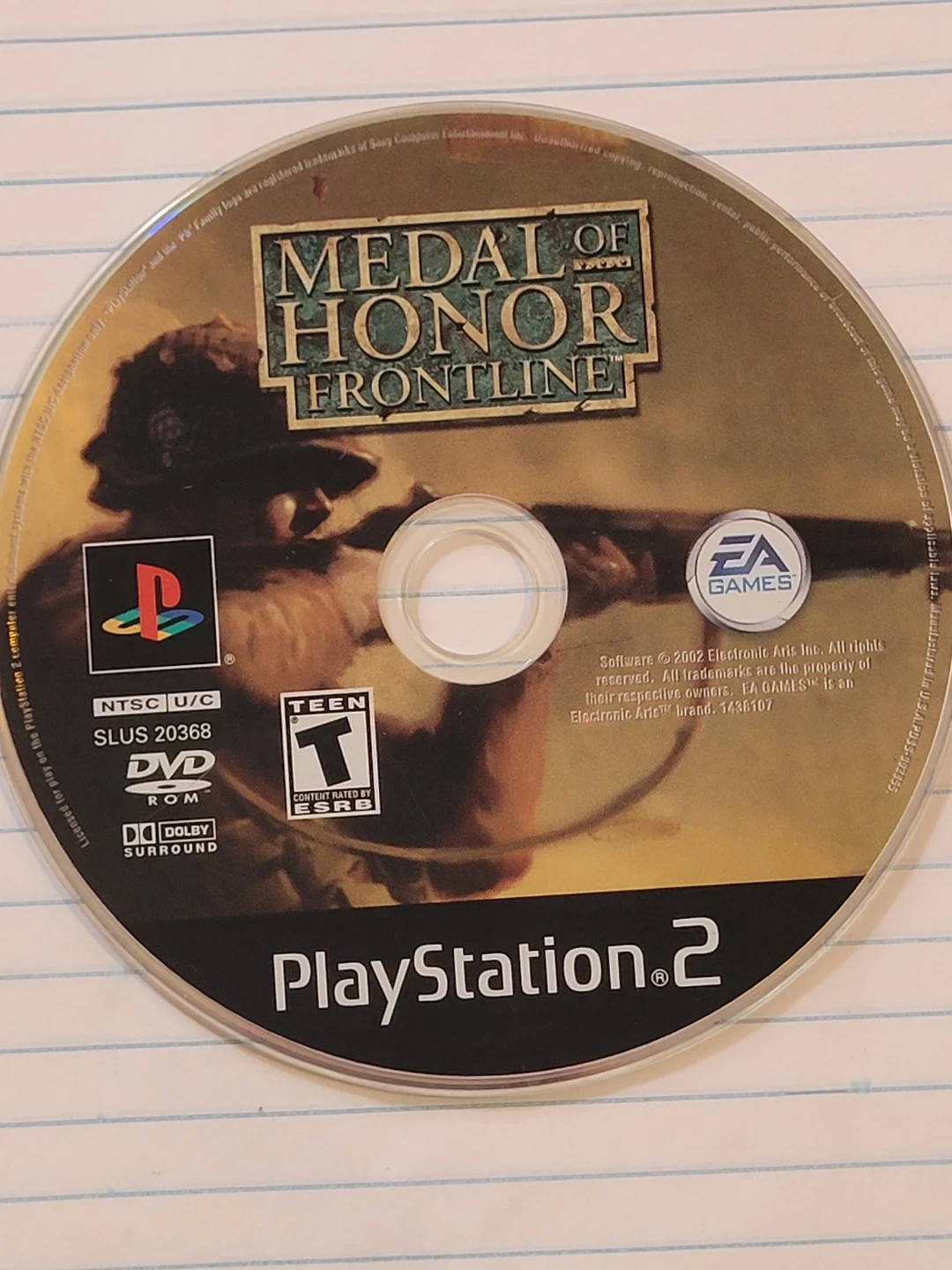 This is the Medal of Honor Frontline game for PlayStation 2. It's a DVD-ROM format game. The disc is rated T for Teen by the ESRB.