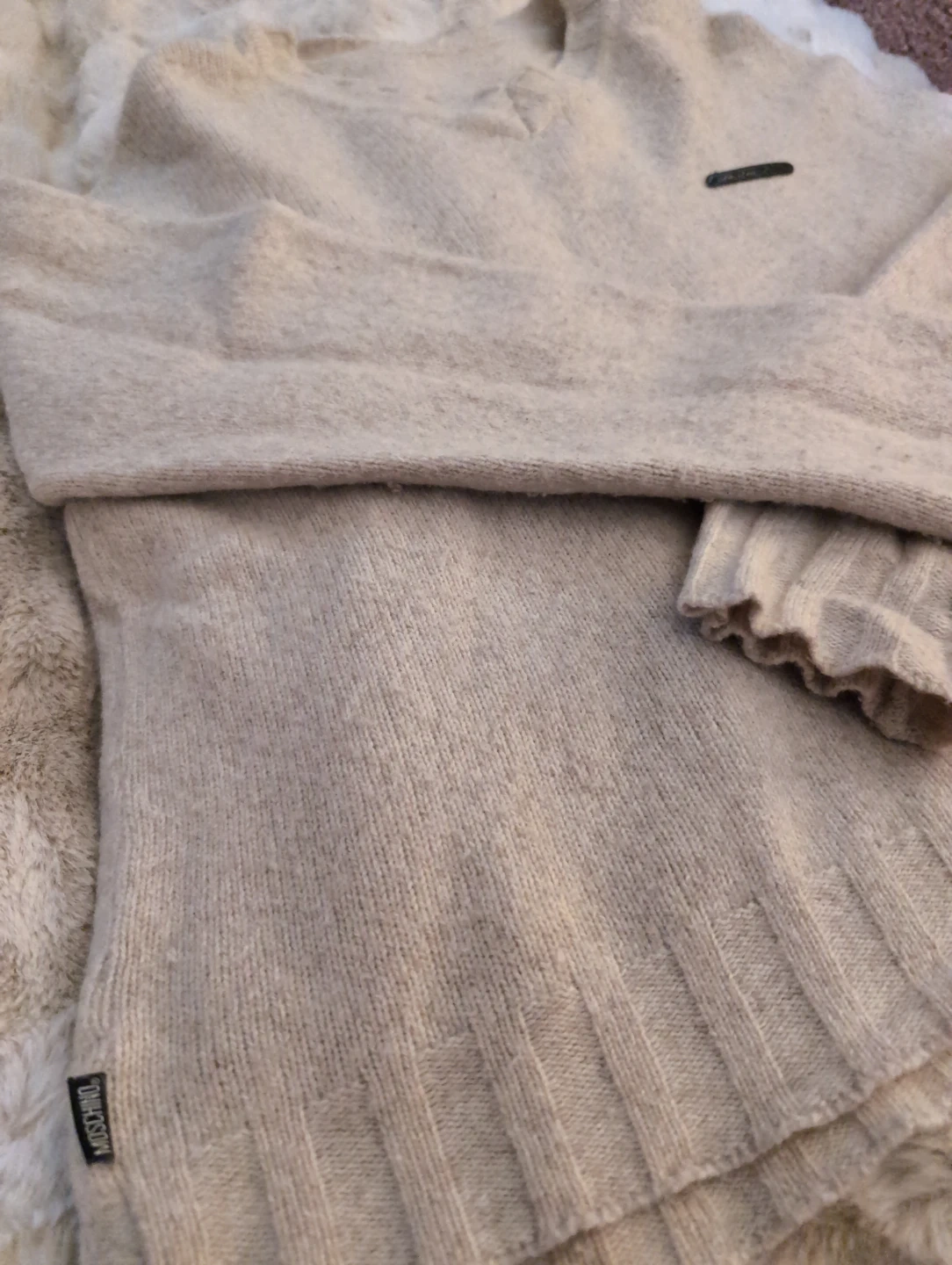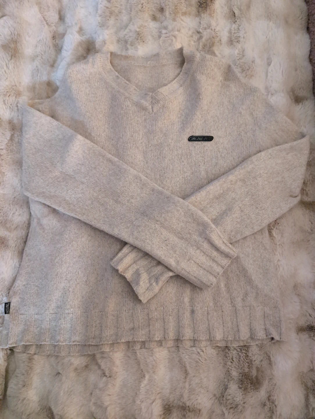 A lovely Moschino V-neck sweater in a light beige colour. It's made from a soft knit material. This sweater is a great layering piece for cooler weather!