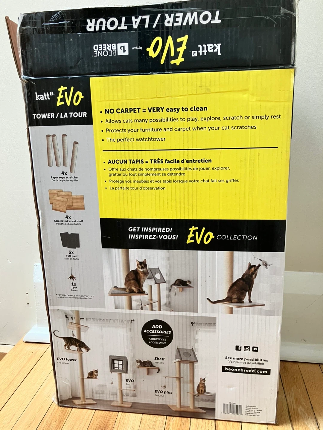 Be One Breed Katt 3 Evo Cat Tower. Floor to ceiling 8 foot pressure mounted cat tower with paper rope and wood bases.