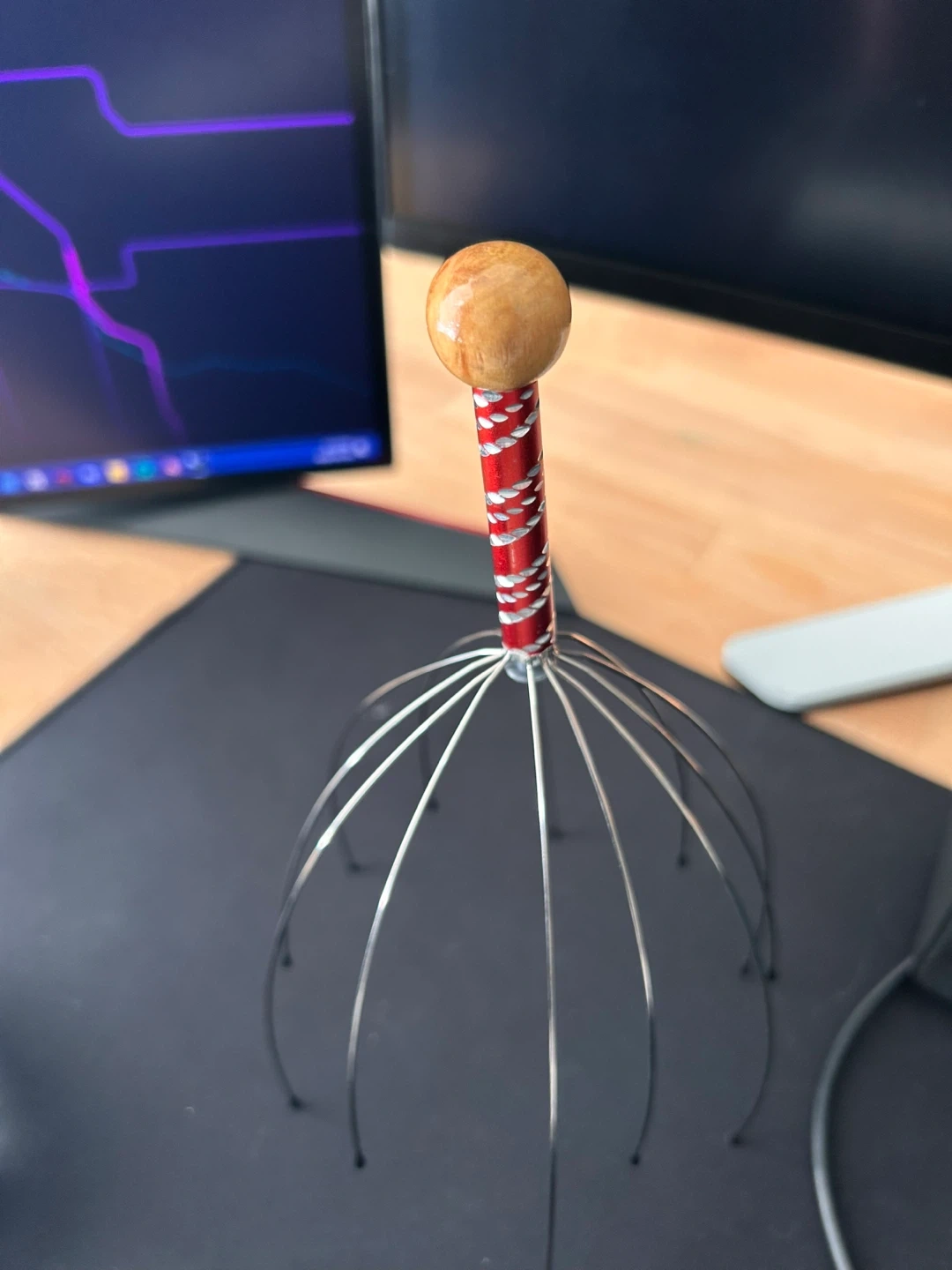 It features flexible metal "fingers" with soft rubber tips that gently glide over your head to relieve tension and improve circulation
