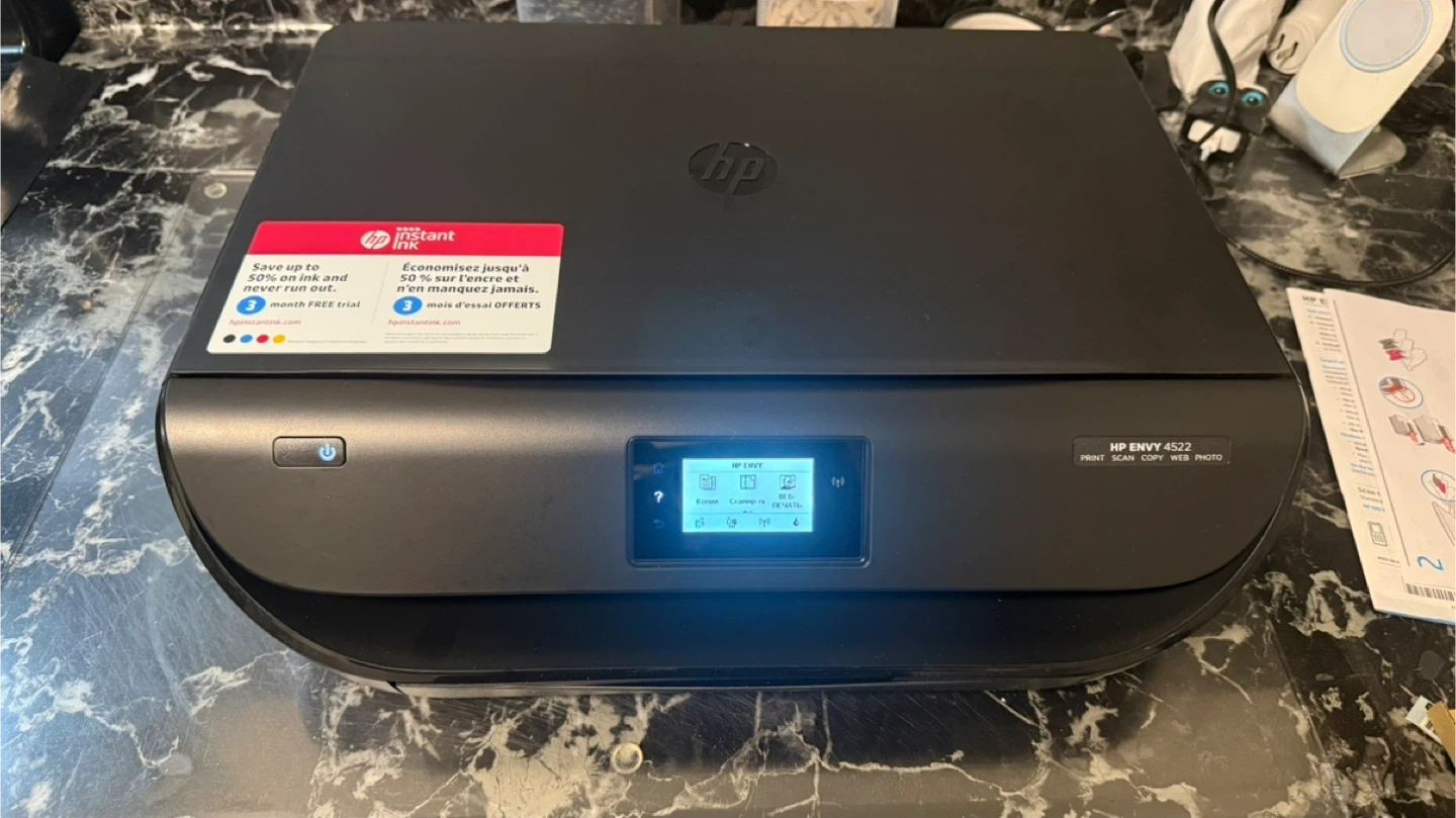 This is an HP ENVY 4522 versatile home printer. It features wireless printing, 2.2-inch touchscreen, and automatic paper tray. It's Instant Ink ready, offering up to 50% savings on ink.