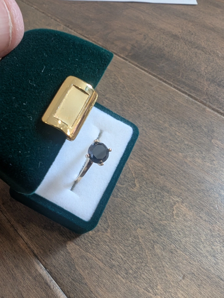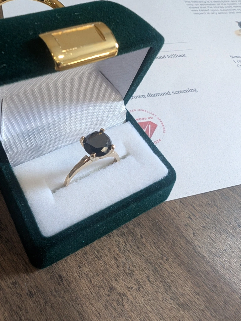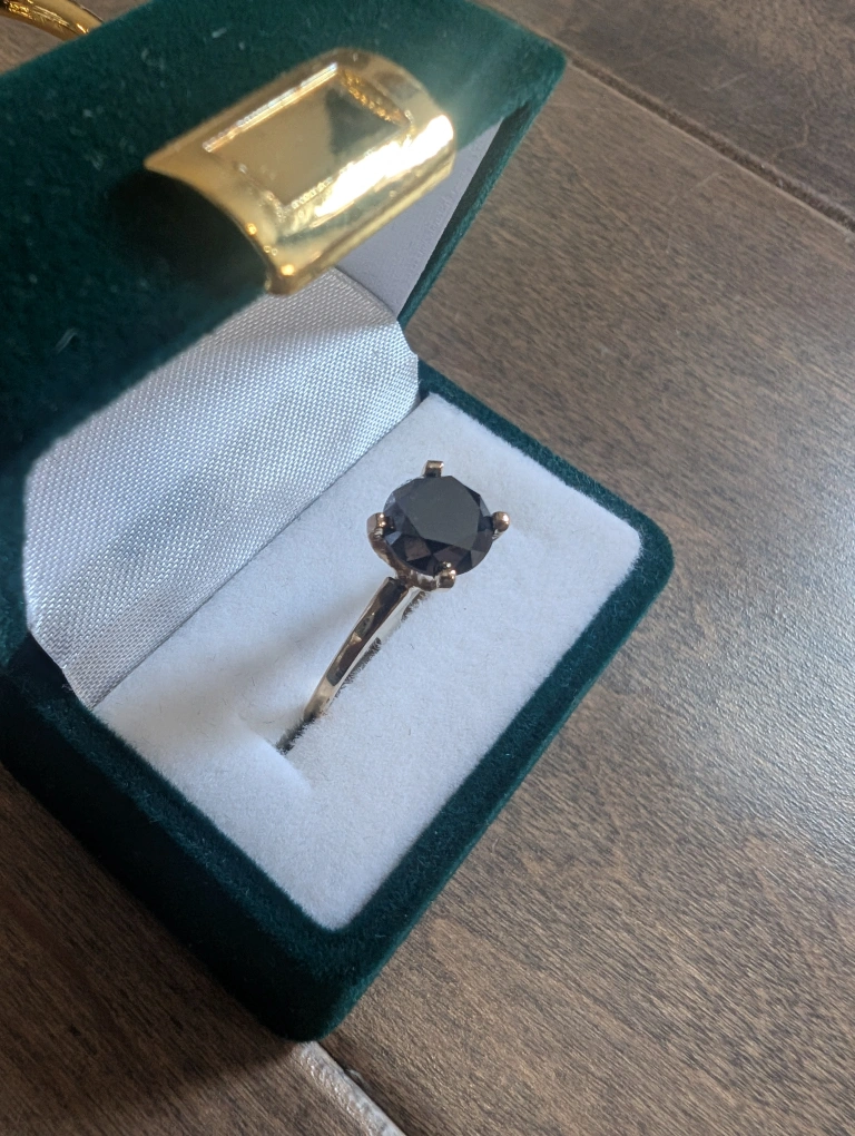 Brand new 10kt yellow gold black diamond ring for sale. One round brilliant cut black treated diamond, 1.80ct carats. Ring size 6, made in Canada. Retail value $2500, selling for $650 FIRM. Comes with appraisal.