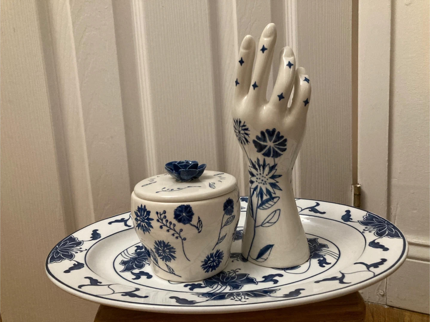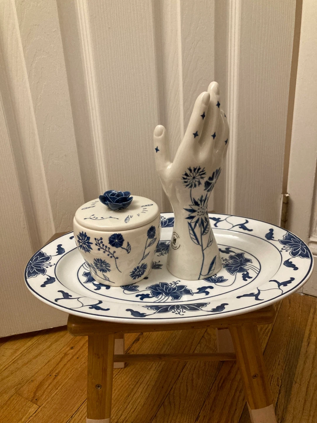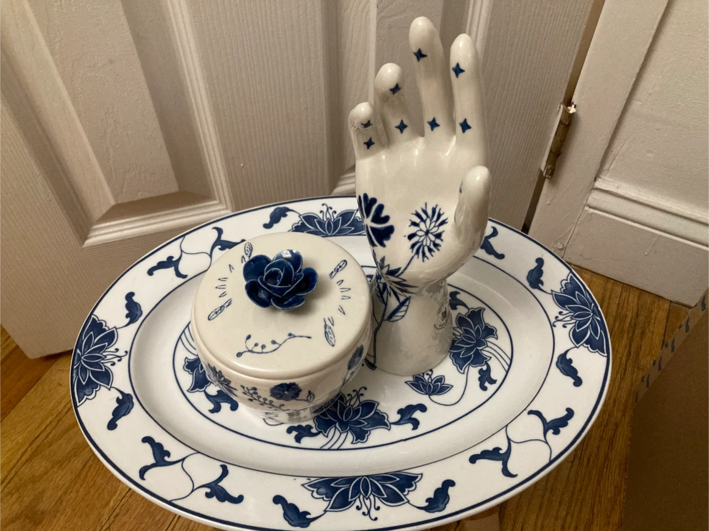 Pick up and cash only. Decorative ceramic set featuring a hand-shaped ring holder and a lidded trinket dish. Both pieces showcase a blue floral pattern on white ceramic. With holding ceramic tray.They're great for organizing small jewelry or decorative items!