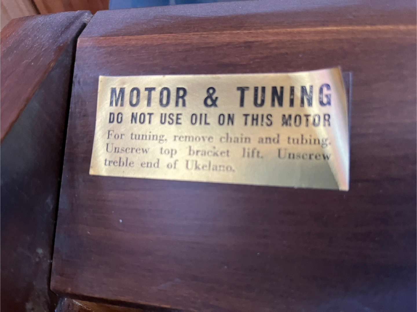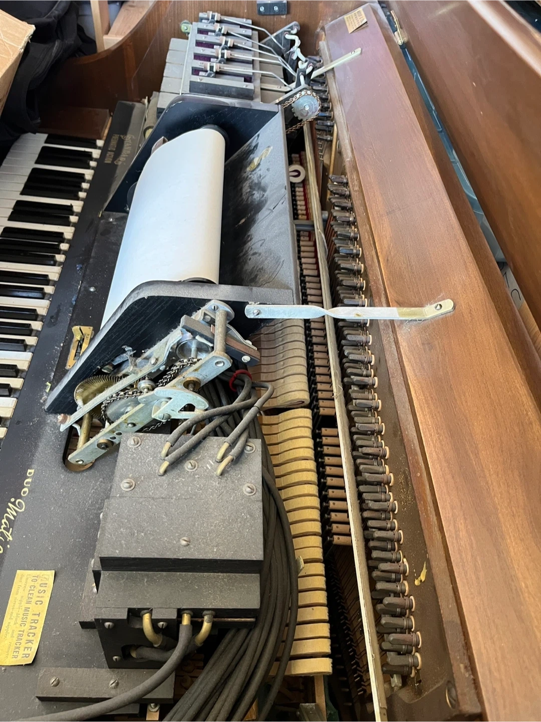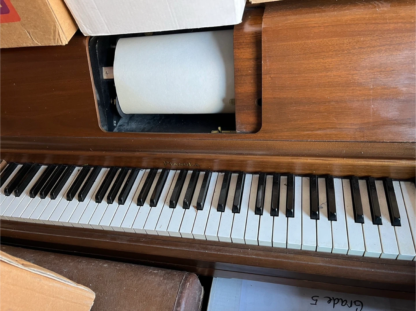 Vintage Pianola player piano with wooden casing. It features a roll mechanism for music playback. This instrument is for enthusiasts and collectors.