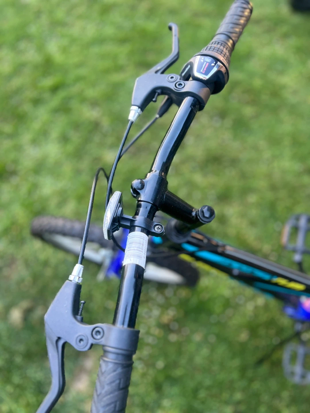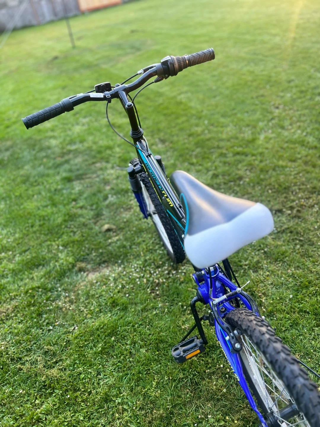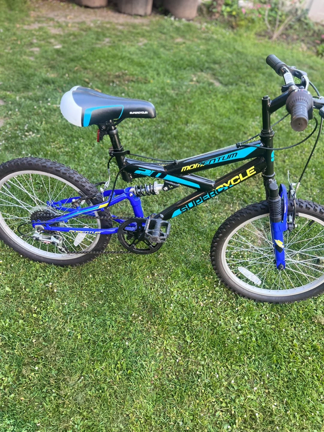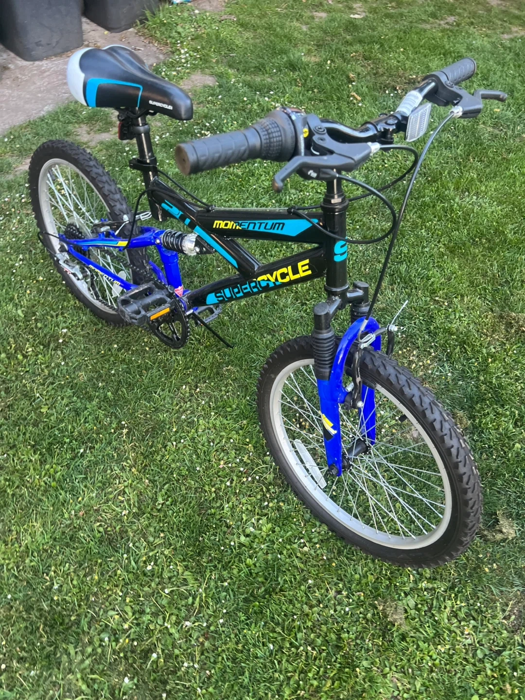 This is a kids' Momentum Supercycle bike, black and blue. It has front and rear suspension for a smoother ride. The tires are 20 inches.