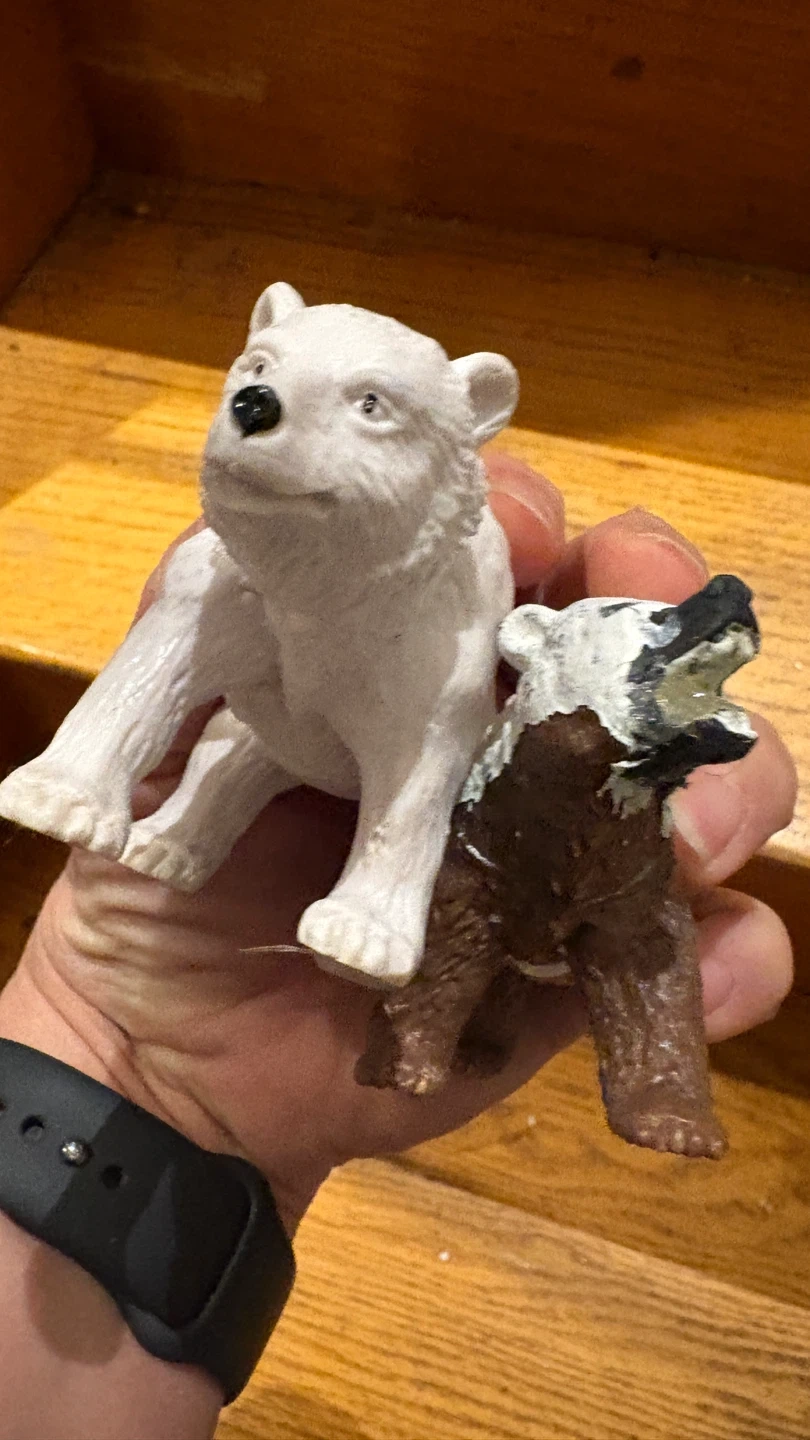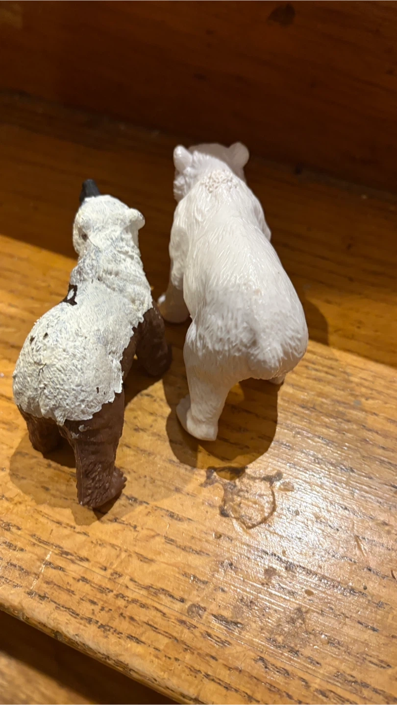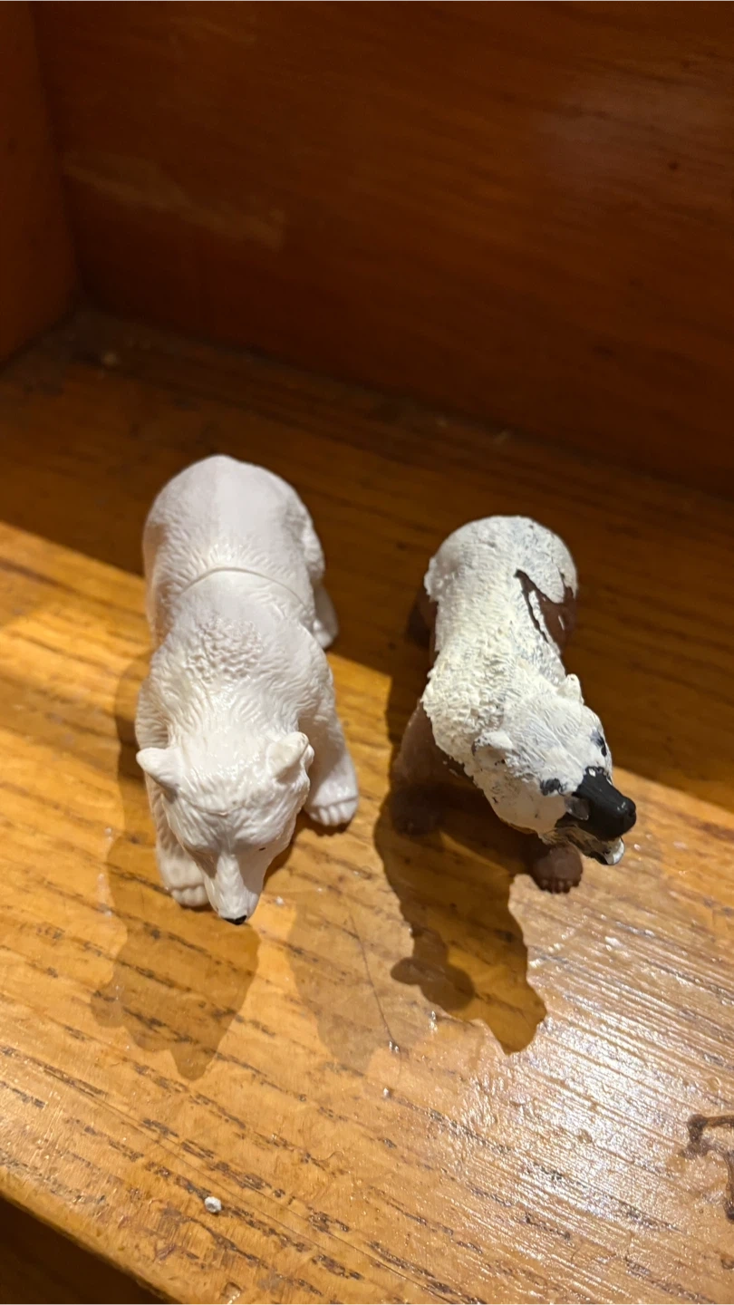 Here are two toy polar bear figures. One is white and the other has brown and white colouring. They're great for imaginative play!