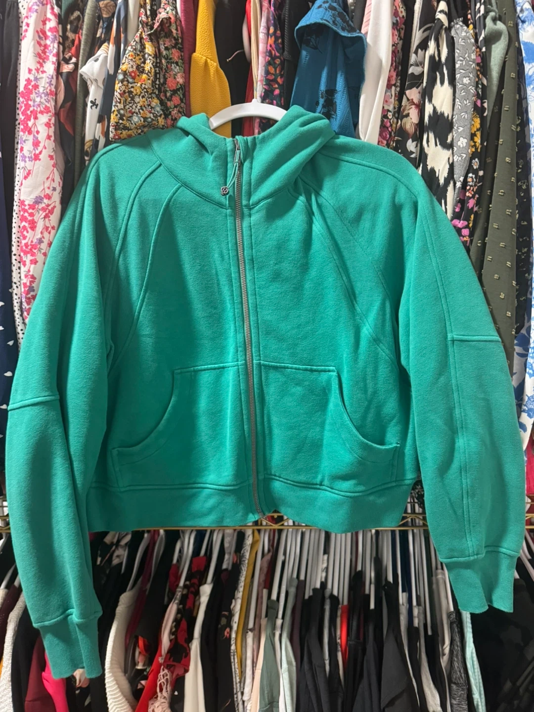 A Lululemon zip-up hoodie in a vibrant green colour. It features a full zipper and front pockets. This hoodie is perfect for layering during cooler weather.