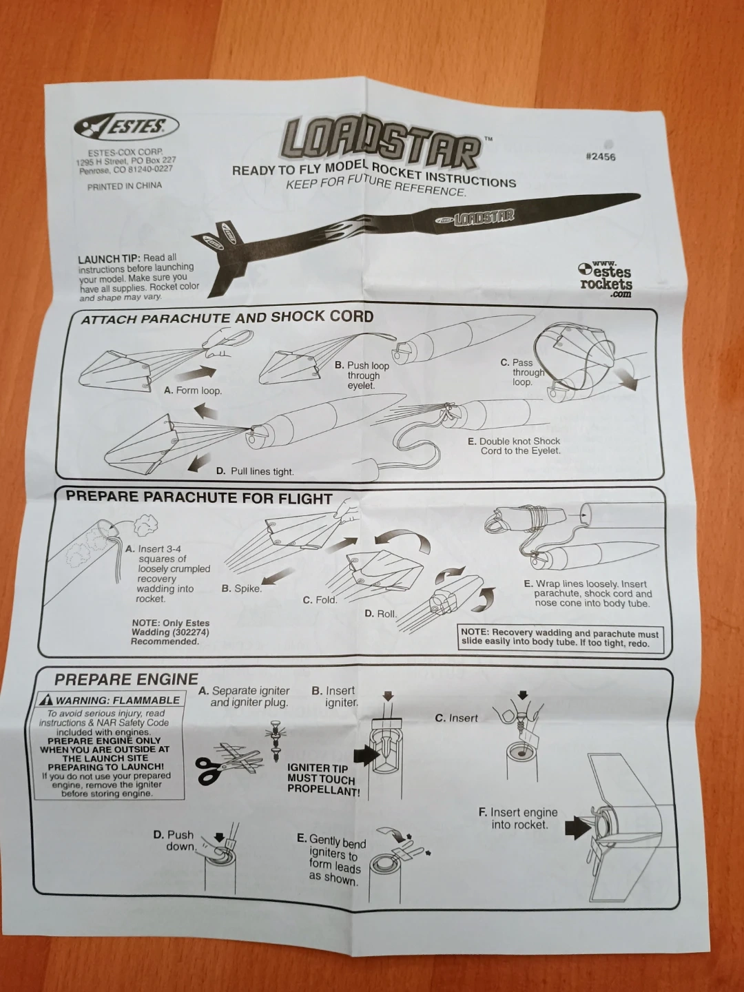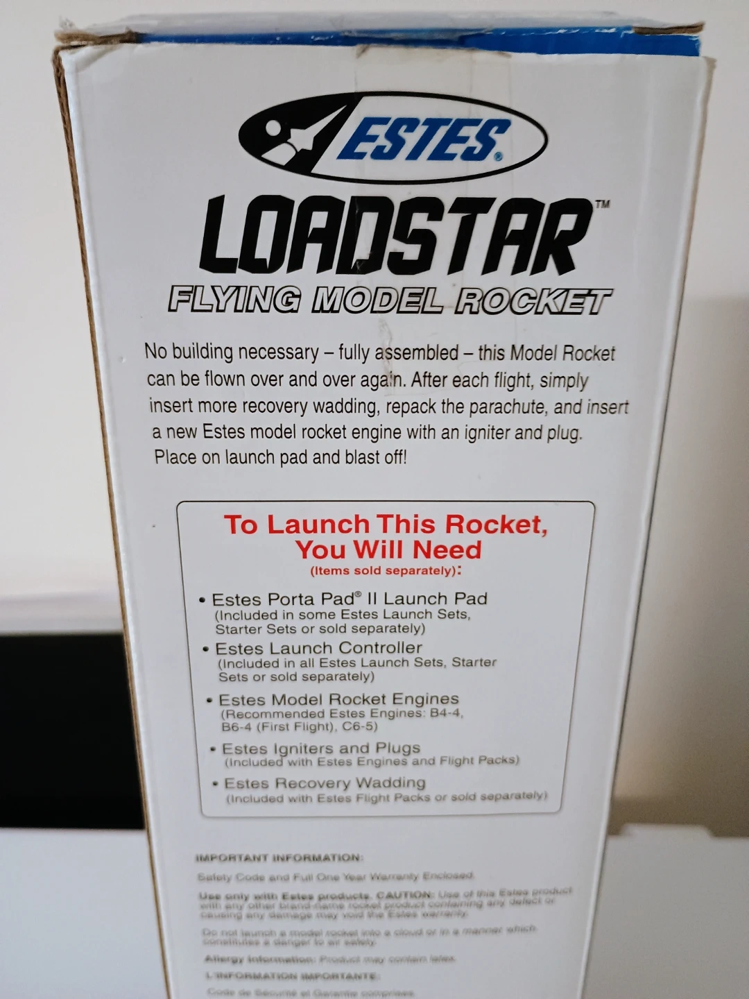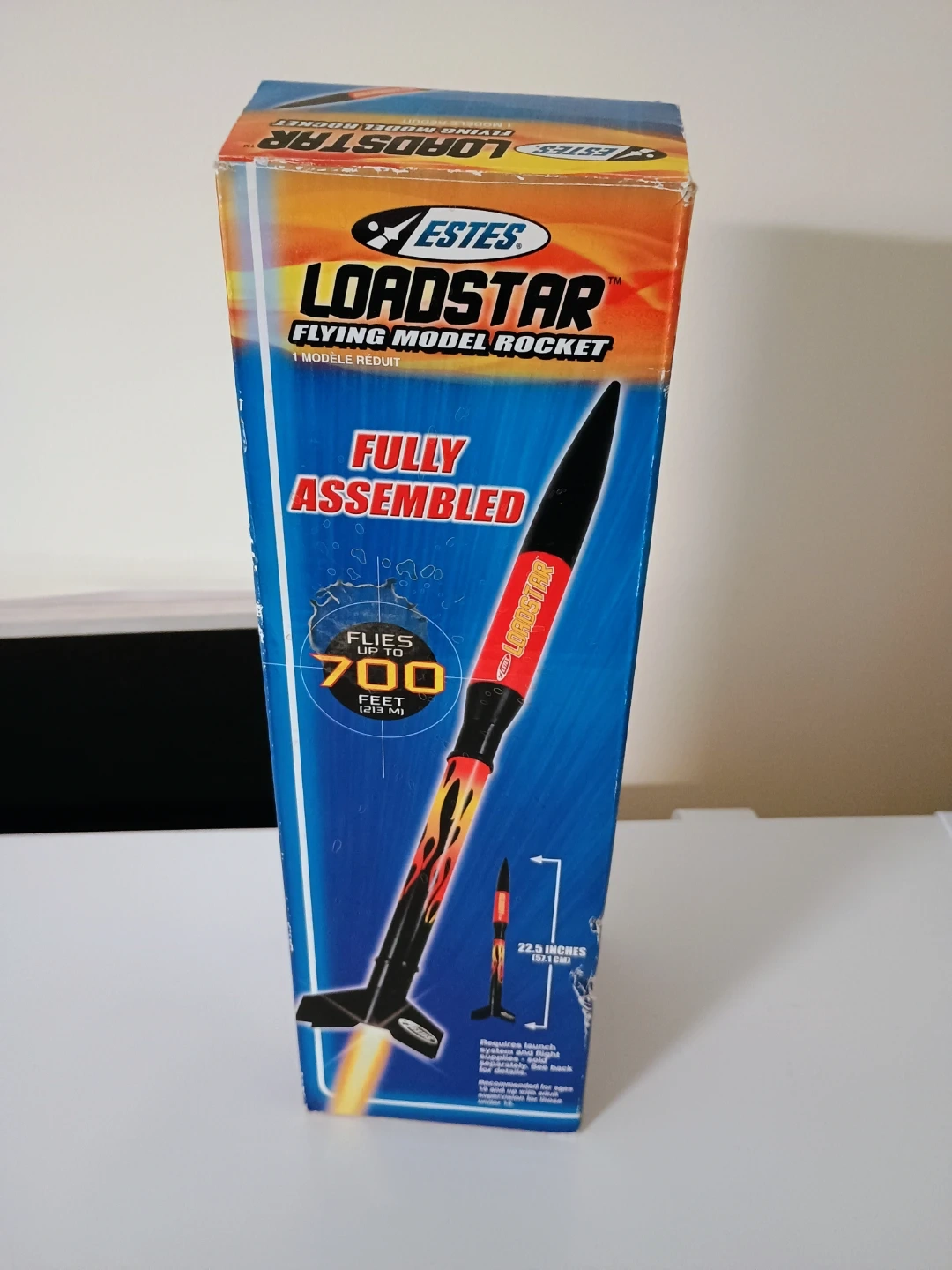 Estes Loadstar flying model rocket. It can fly up to 700 feet. The rocket is 22.5 inches long. Recommended for ages 10 and up.